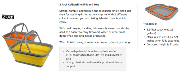 - BPA FREE and GREAT VALUE: Our collapsible sink is in thermoplastic rubber (TPR) construction that is BPA free and dishwasher safe. You only need to pay 1 but get TWO. Great value. With different color, you can distinguish which one is which easily. Imagine you are camping, you can use one to wash dishes, the other is to put clean dishes.