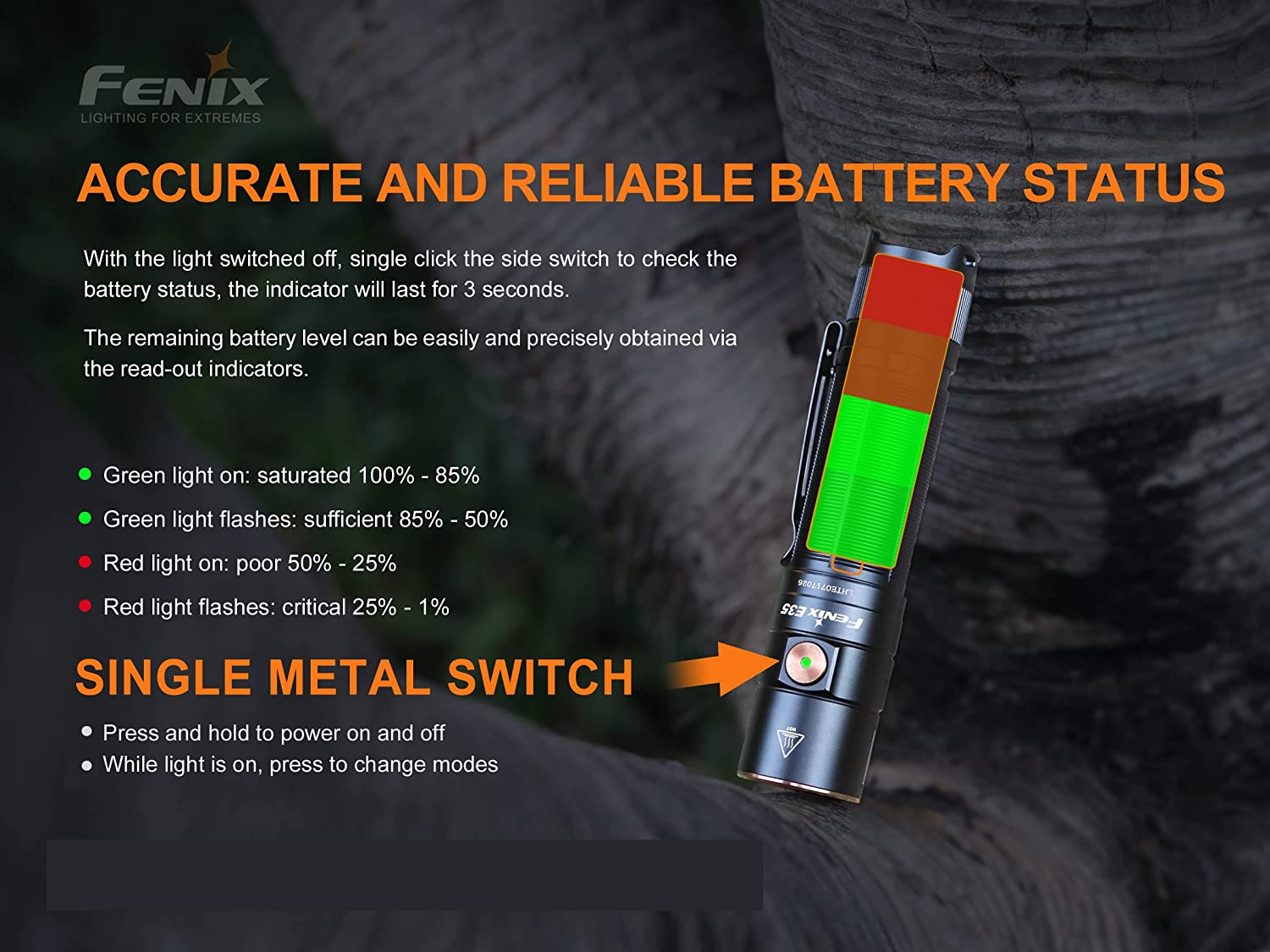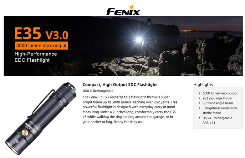 | Included Components | Fenix E35 V3.0, LumenTac Organizer |