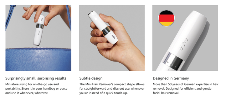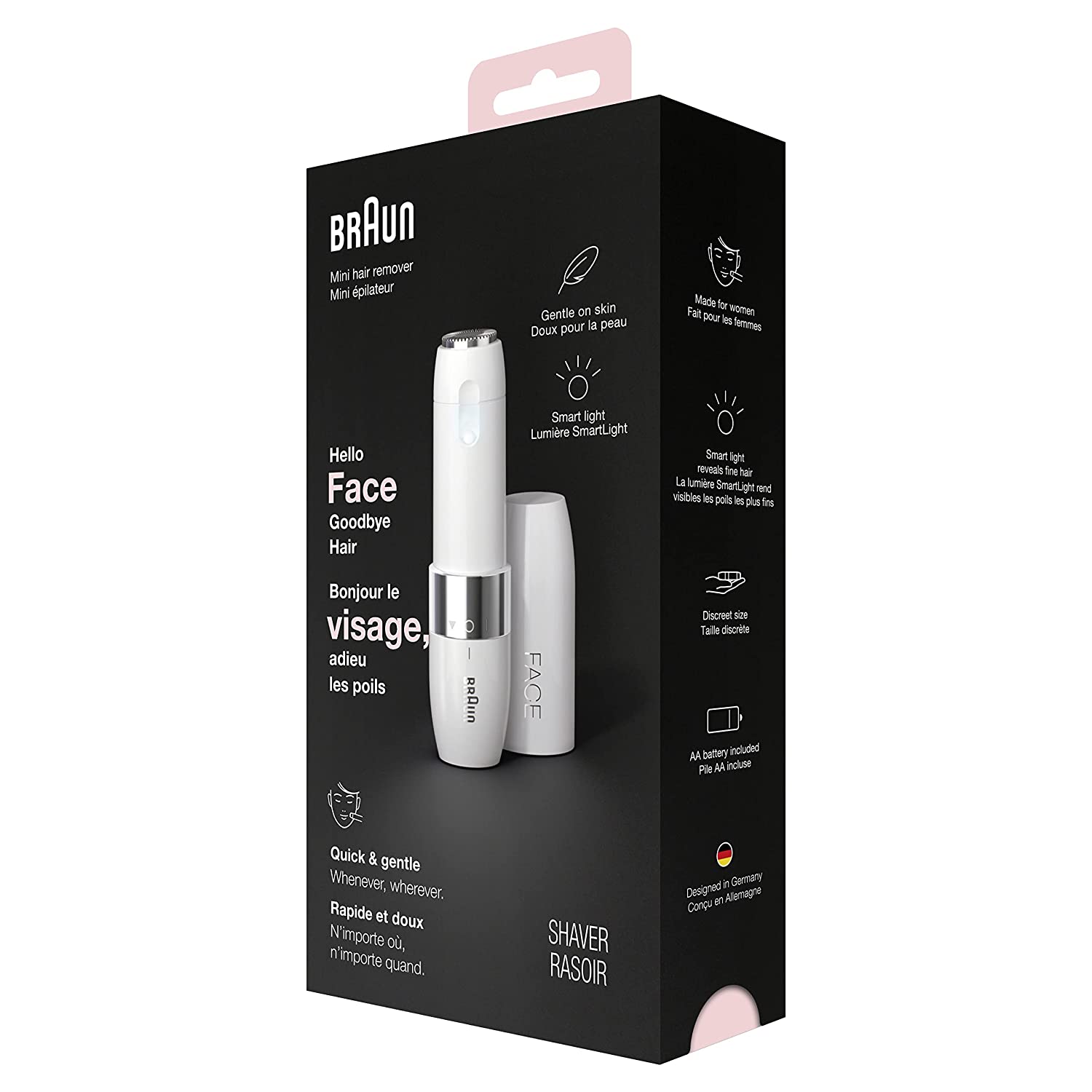 An elegantly designed, mini-sized electric facial hair remover for women, delivering fast and gentle hair removal results. The Braun Mini Hair Remover cuts hair close to skin level, leaving your face smooth, consistent and free of peach fuzz. Quick and gentle hair removal: whenever, wherever.Box includes: 1 X Mini Hair Remover1 X White Cap1 X Cleaning Brush1 X AA Battery