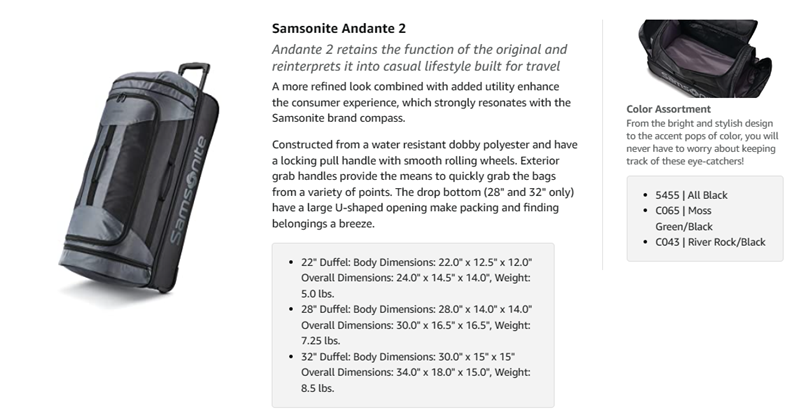 INTRODUCING NEW ANDANTE WHEELED DUFFELS. Andante 2 retains the function of the original and reinterprets it into casual lifestyle built for travel. A more refined look combined with added utility enhance the consumer experience, which strongly resonates with the Samsonite brand compass. The duffels are constructed from a water resistant dobby polyester, and have a locking pull handle with smooth rolling wheels. Exterior grab handles provide the means to quickly grab the bags from a variety of points. The drop bottom (2 larger sizes), and large U-shaped opening make packing and finding belongings a breeze. Available in three sizes and three colors Andante 2 will delight the consumer.