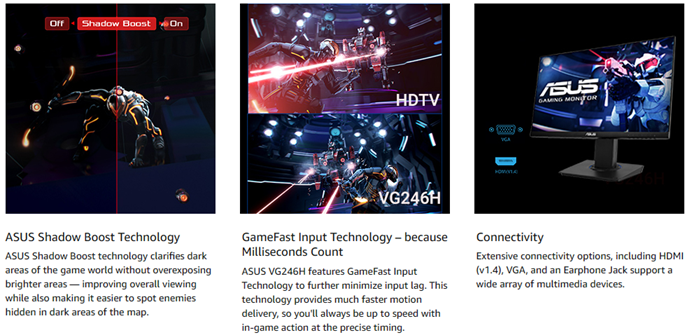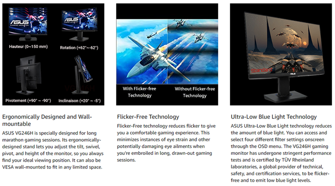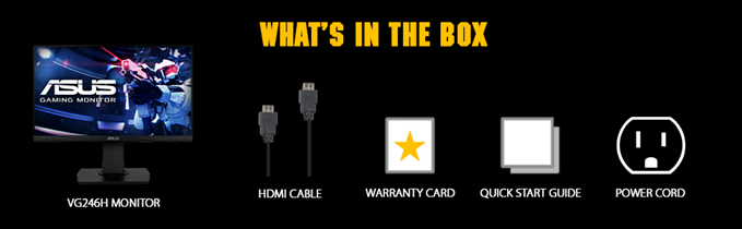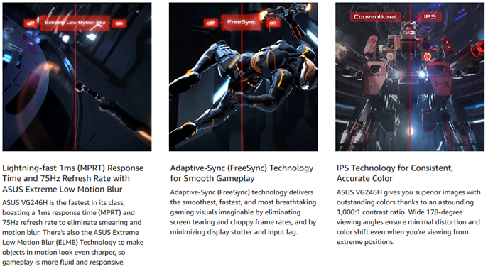 Designed for intense, fast-paced games, ASUS VG246H is a 23.8” Full HD gaming IPS display with an ultra-fast 1ms (MPRT) response time and 75Hz refresh rate to give you super-smooth gameplay. It features FreeSync technology to eliminate screen tearing and choppy frame rate and ELMB for sharper images.