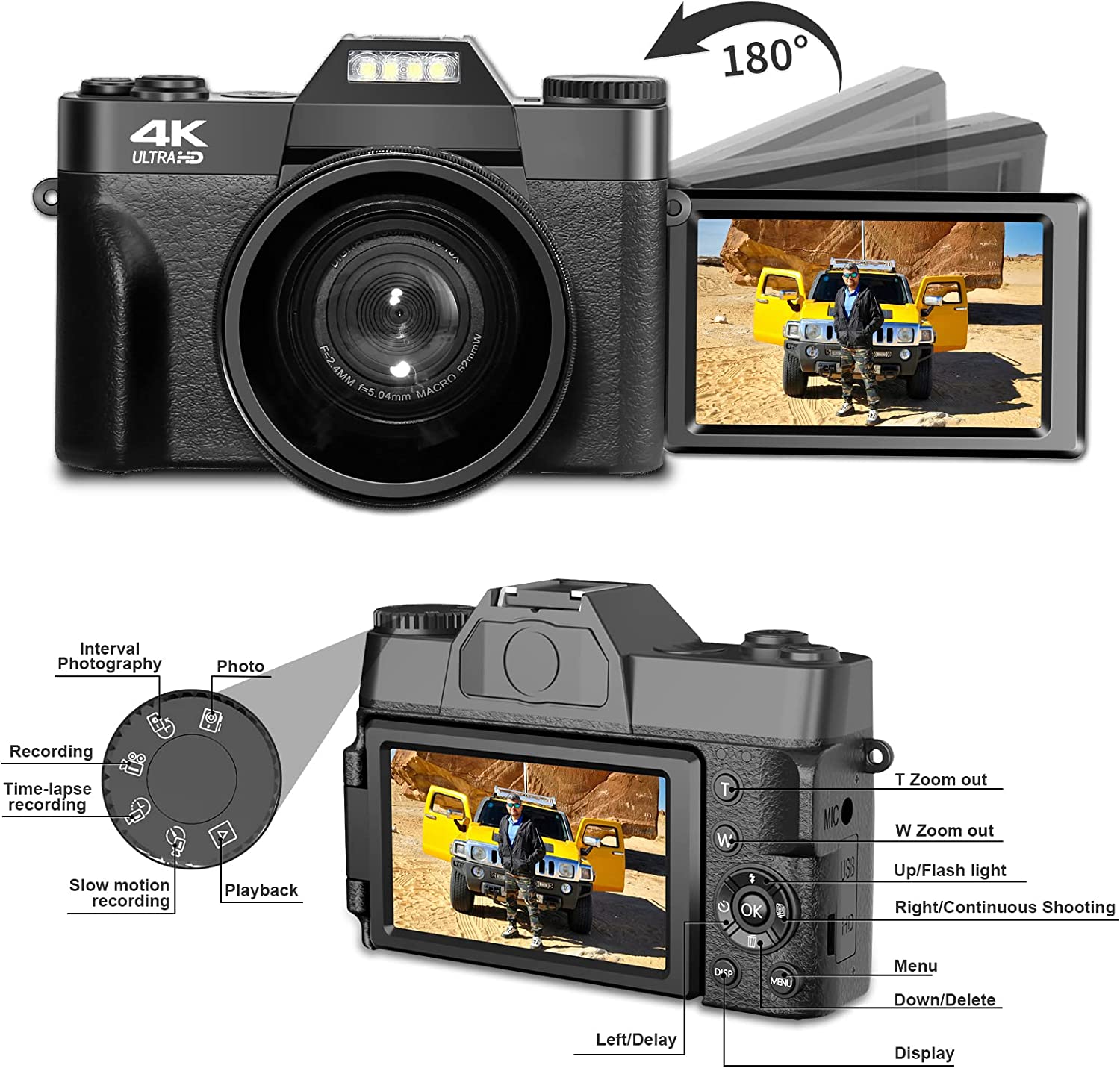 ?【Digital Camera with Wide Angle Lens & Macro Lens】The 4K camera equipped the camera with a professional detachable 52mm wide angle lens with macro lens, so the camera is great for capturing wide horizons easily, and macro lenses capture the diversity of the tiny world. Sharp 4K photos can be ruled out with manual focus. With a knob on the top of the camera, you can switch between photos, video, time-lapse photography and other features.