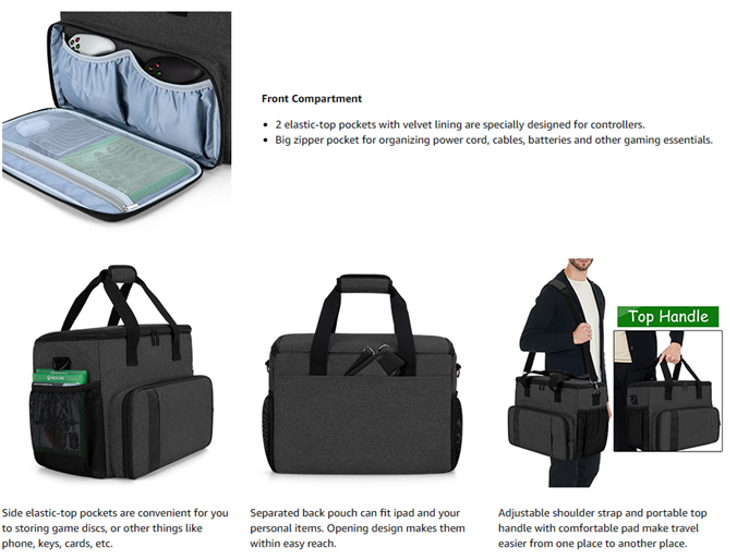 WELL ORGANIZED: Side mesh pouches are used for storing game discs or other game accessories. Separate back layer is attached for ipad or other personal items. (Bag only, NOT includes console and accessories.)protects the equipment away from bumping and damage.