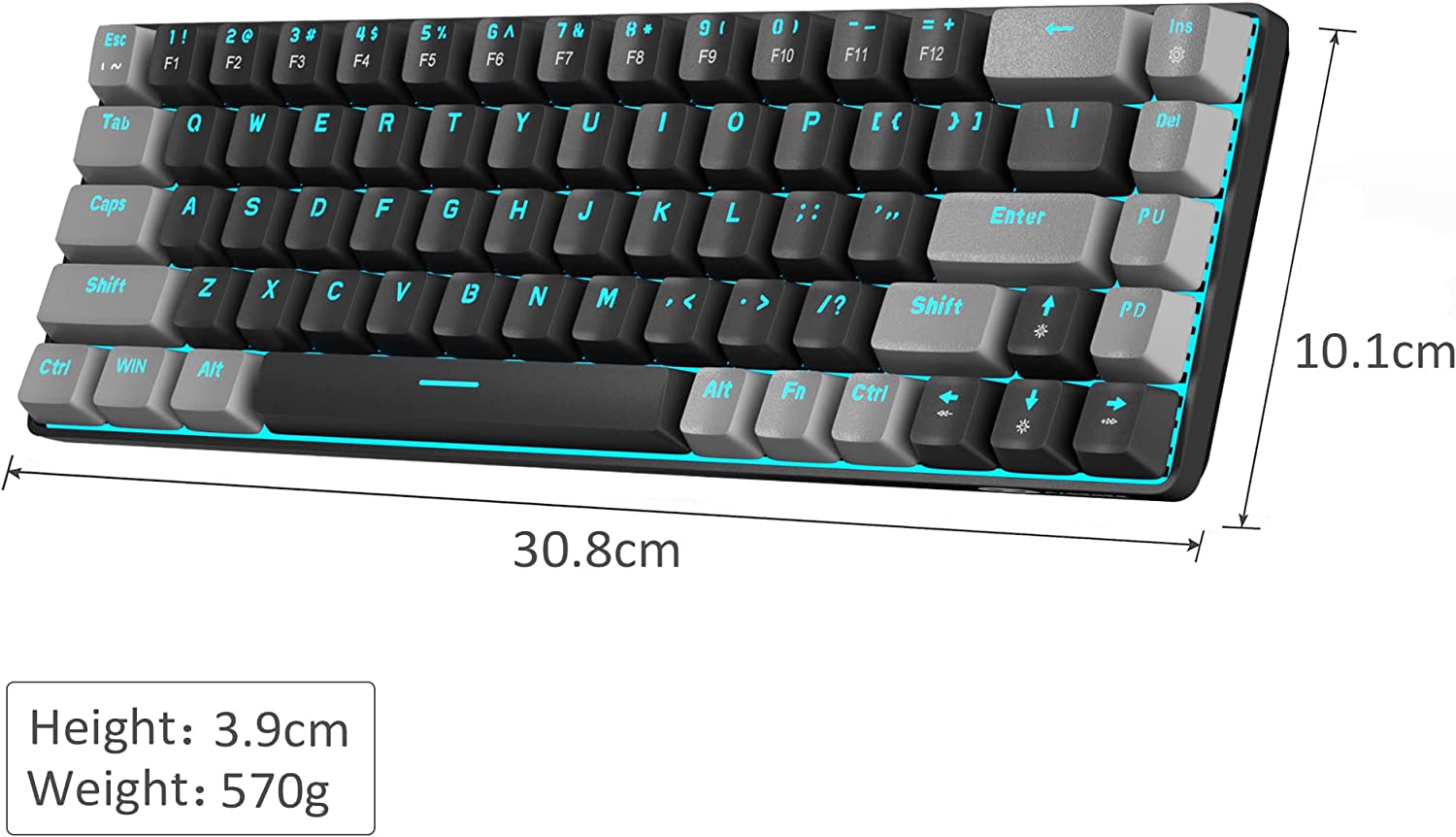 • Classic charming blue LED backlit: Customize multiple illuminated LED light effects, supports about 15 backlight modes, press Fn + Ins can control it, FN + ←/→ control backlight speed, FN + ↑/↓ control backlight brightness.