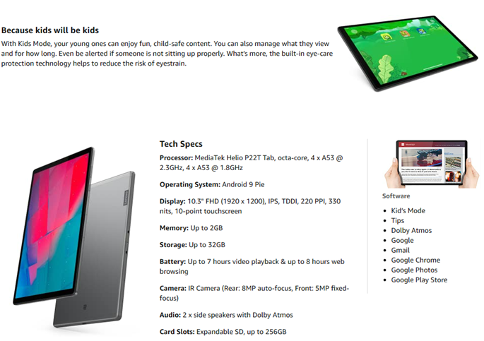 The Lenovo Tab M10 Plus is here to exceed your expectations. Part of the 2nd generation Tab family, this media tablet is designed for the whole family. Outside, the standout metal design and premium look and feel combine with modern simplicity. With a full metal back cover, narrow bezels, and high panel-to-body ratio, you'll love the clean look. The 10.3" FHD screen and dual speakers tuned by Dolby Atmos® deliver immersive entertainment. Inside, this useful tablet device has an Octa-Core processor with up to 2.3 GHz main frequency, 32GB storage and 2GB RAM, and runs on the Android™ operating system to deliver fast, powerful performance. Created for everyone in the family to enjoy, the Lenovo Tab M10 Plus includes Kid's Mode with dedicated content, parental control, and specialized eye protection. The bumpy environment alert and posture alert let you know when this Android tablet isn't being used correctly. Make it truly helpful in your daily life by adding a folio case that protects your device. You can also transform your media tablet into a smart hub by docking into a smart charging station, and get more things done hands-free, thanks to the Google Assistant.