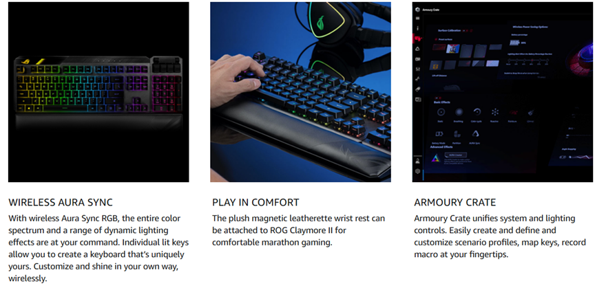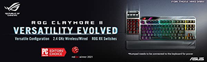 The ROG Claymore II elite gaming keyboard delivers a host of features designed to give you exciting new ways to play. Create your ideal gaming setup by placing the new detachable numpad on whichever side you prefer; then choose between wired or wireless mode and light it all up with Aura Sync. And once you’re in battle, assume full tactical control with ROG RX Optical Mechanical Switches and customizable hotkeys. The detachable numpad can be attached on either side of the keyboard, or it can be removed entirely if you prefer to use ROG Claymore II in TKL mode (80%). It can also be programmed to be used as a macro keypad for complex in-game commands. This flexibility gives you various combinations to suit your play style and gaming setup. ROG RX Red and RX Blue Optical Mechanical Switches offer consistent, wobble-free keystrokes with a superfast 1 ms response and 100-million-keystroke lifespan. These premium switches have a hollow-square stem design and they feature embedded RGB LEDs providing all-round per-key lighting. Play in wired or wireless 2.4 GHz RF mode, with a superfast 1 millisecond response time. A 4000 mAh battery and energy-efficient design give you up to 43 hours of nonstop gaming in wireless mode on a single charge, even with RGB lighting on. 30 minutes of USB-C fast charging* allows ROG Claymore II to be operated for up to 18 hours (lighting off). The fast-charge function can be switched off to use the provided USB passthrough for convenient connection to other devices. The detachable numpad includes four media control keys that can be programmed into hotkeys for convenient productivity shortcuts or macro in-game commands. There’s even a built-in control wheel for quick volume adjustment. With wireless Aura Sync RGB, the entire color spectrum and a range of dynamic lighting effects are at your command. Individually lit keys allow you to create a keyboard that’s uniquely yours. Customize and shine in your own way, wirelessly.