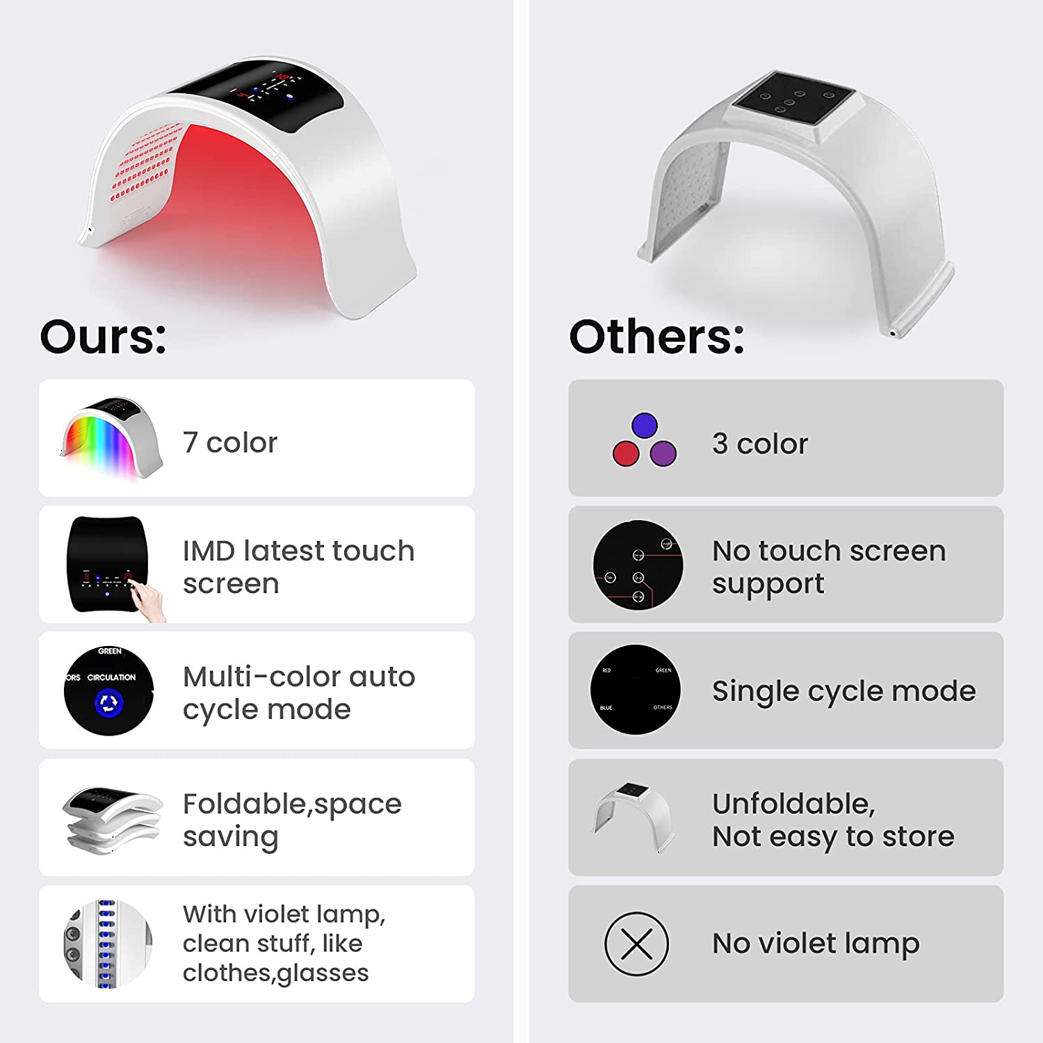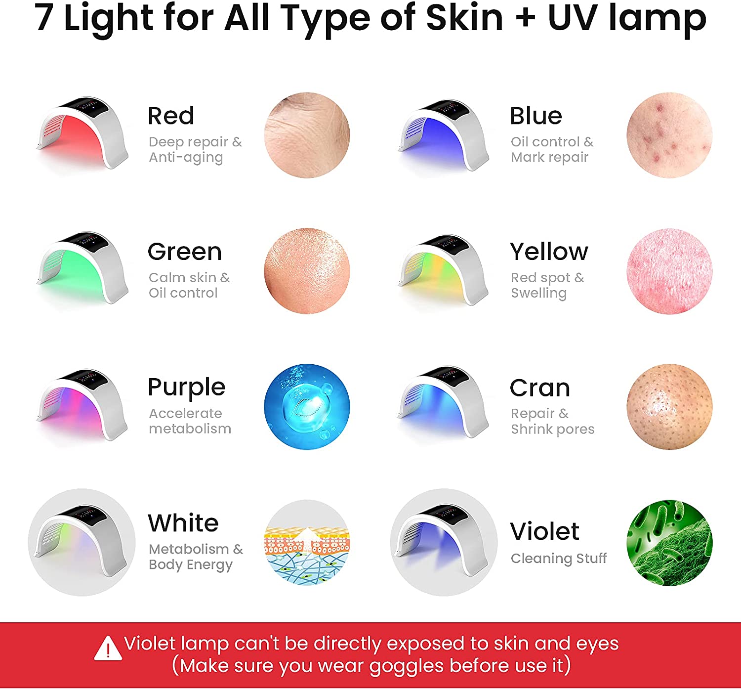 • 【8 in 1 LED Light Therapy】: Red Light - For acne and repair skin; Blue Light - Calms and tightens skin; Green Light - Lightens scars and oil control; Yellow Light - Reduces redness and Freckle; Purple Light - Whitening and brightening; Cyanine Light - Soothing and wrinkles; White Light - Fine and smooth skin. Violet Light - Self-cleaning of the device.