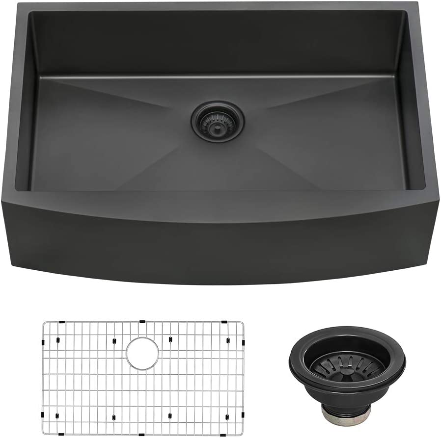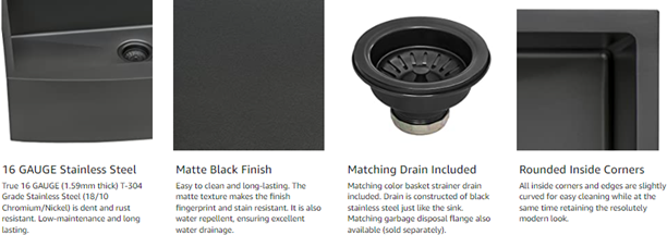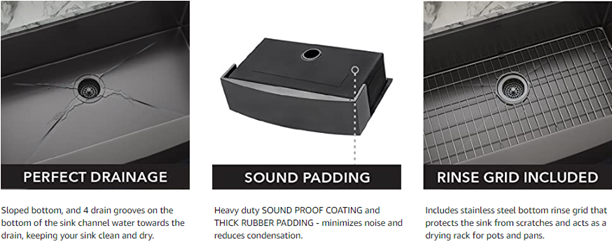 - MATCHING COLOR (Gunmetal Black) BASKET STRAINER drain assembly included. [Note: Basket strainer only works with standard plumbing. If installing a garbage disposal unit, use matching color disposal flange (Model # RVA1041BL) sold separately] | Stainless Steel BOTTOM PROTECTIVE GRID included - protects your sink surface and acts as a drying rack.