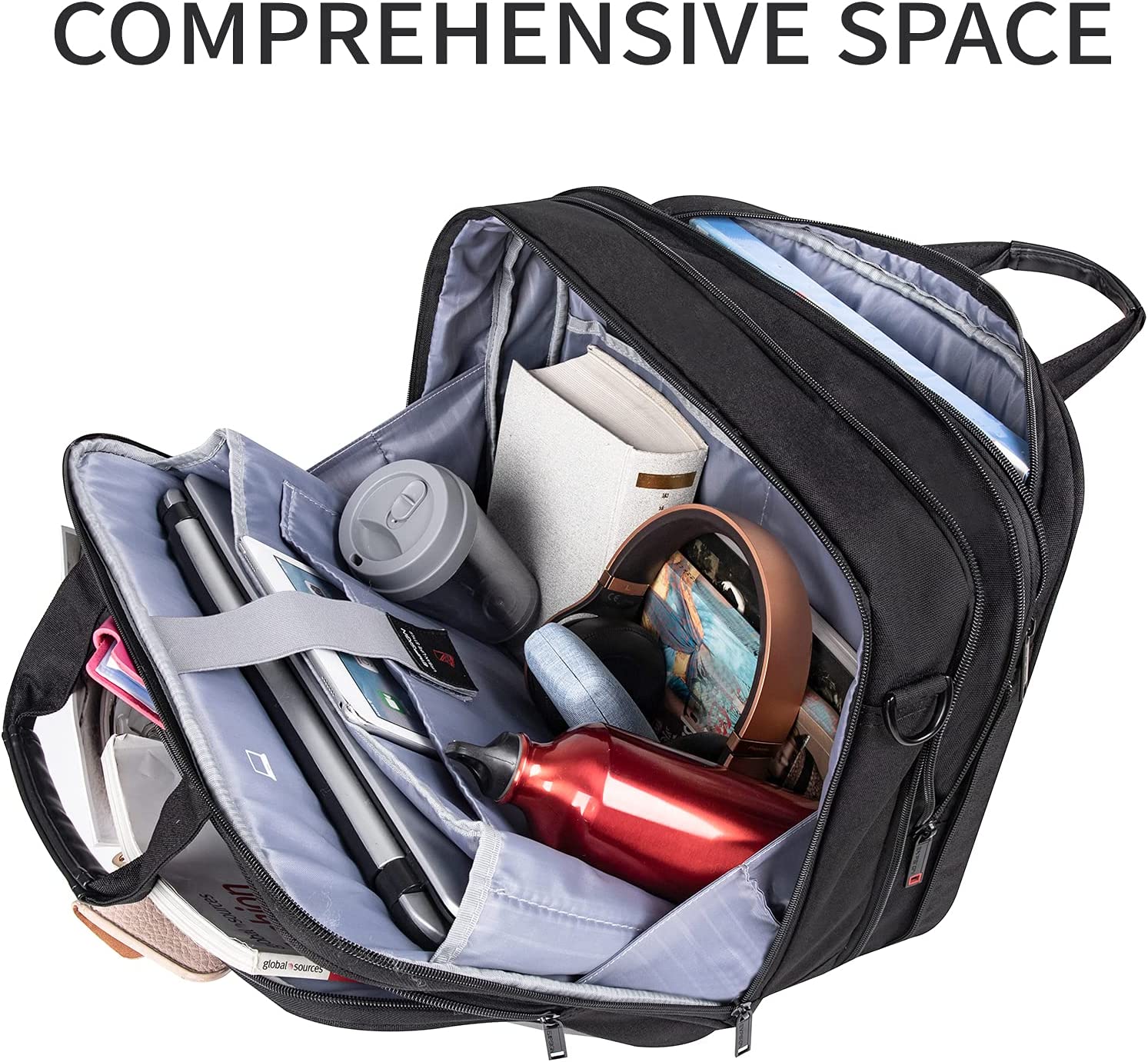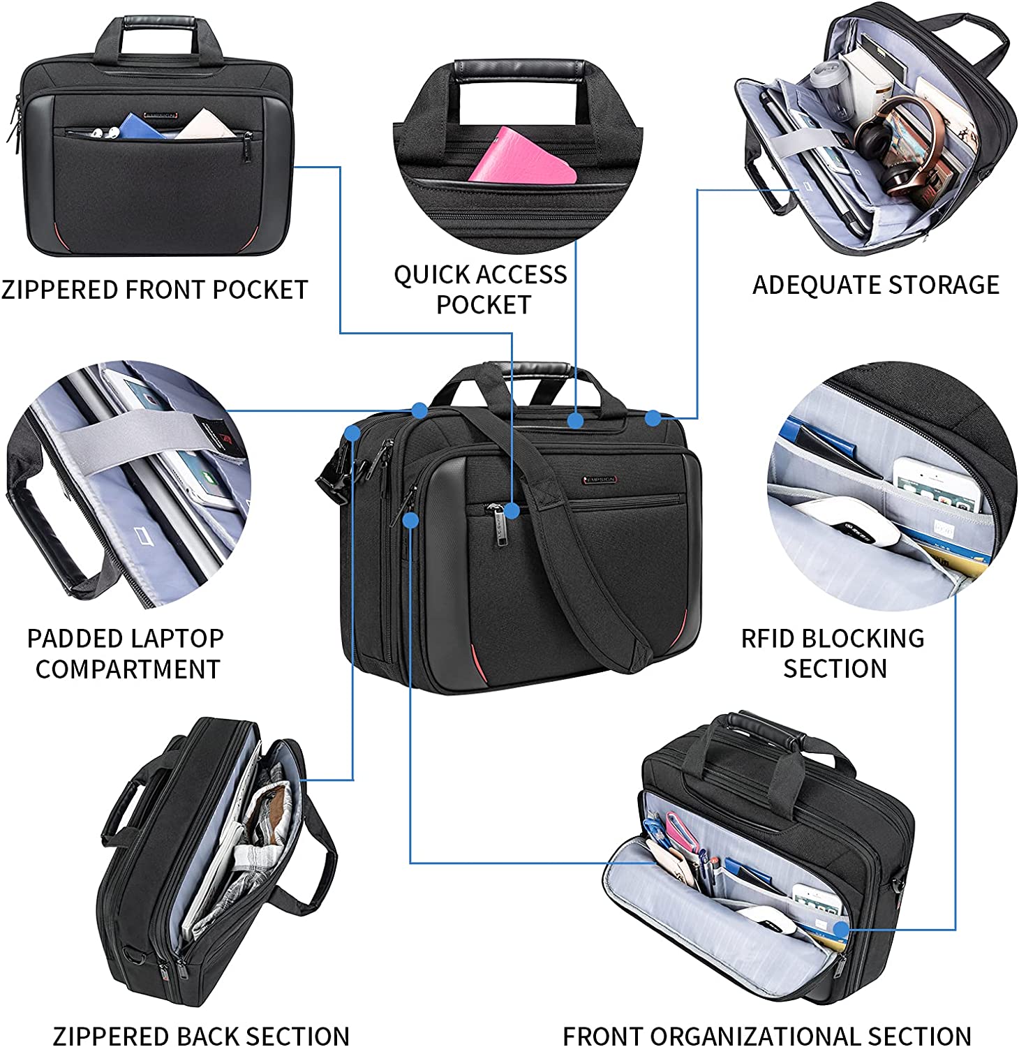 - COMPREHENSIVE WORKSPACE: Large capacity laptop bag accommodates your laptops, tablets, mouse, chargers, storage drives, papers/folders, business cards, keys, and other on-the-go essentials. Features multiple organizational pockets allowing you to organize all your items in one computer bag—no fumbling to find stuff! Expansion zipper provides more room to handle more carrying needs.