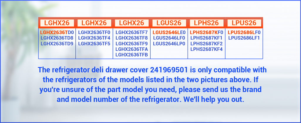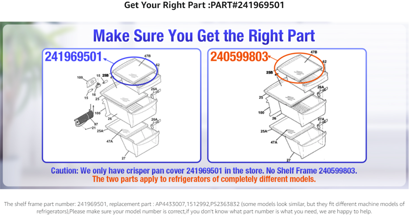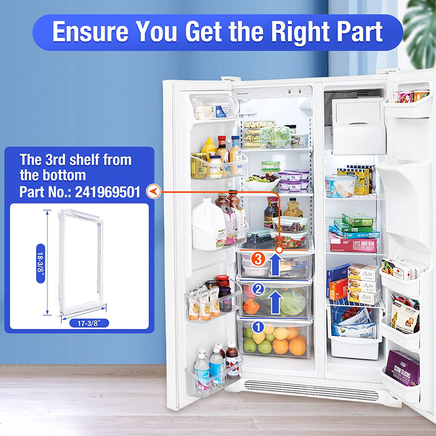 - 【241969501 Shelf Frame Without Glass Refrigerator】241969501 refrigerator shelf frame is a frame that supports the deli drawer, serves as a shelf in the refrigerator and covers the deli drawer.241969501 refrigerator crisper pan cover and 240599803 frame adapt to completely different refrigerator models, please confirm your required model 241969501 or 240599803 before purchase, we only sell 241969501 refrigerator shelf