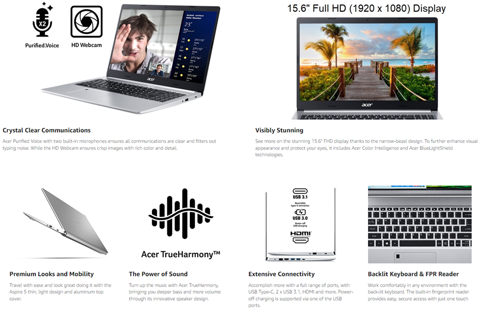 Acer Aspire 5 A515-55-35SE comes with these high level specs: 10th Generation Intel Core i3-1005G1 Processor 1.2GHz with Turbo Boost Technology up to 3.4GHz (4MB Smart cache), 15.6" Full HD (1920 x 1080) widescreen LED-backlit IPS Display, Intel UHD Graphics, 4GB DDR4 On-Board Memory, 128GB NVMe SSD, 1 - Available Hard Drive Bay, True Harmony Gen 2 Technology, Two Built-in Stereo Speakers, Acer Purified.Voice Technology with Two Built-in Microphones, Intel Wireless Wi-Fi 6 AX201 802.11ax Dual-Band 2.4GHz and 5GHz featuring 2x2 MU-MIMO technology (Max Speed up to 2.4Gbps), 10/100/1000 Gigabit Ethernet LAN (RJ-45 port), Bluetooth 5.0, Back-lit Keyboard, Acer Fingerprint Reader supporting Windows Hello, HD Webcam (1280 x 720), 1 - USB 3.1 (Type-C) Gen 1 port (up to 5 Gbps), 2 - USB 3.1 Gen 1 Port (one with Power-off Charging), 1 - USB 2.0 Port, 1 - HDMI Port with HDCP support, Lithium-Ion Battery, Up to 8-hours Battery Life, Windows 10 Home (S mode), 3.97 lbs. | 1.8 kg (system unit only) (NX.HSPAA.00A)