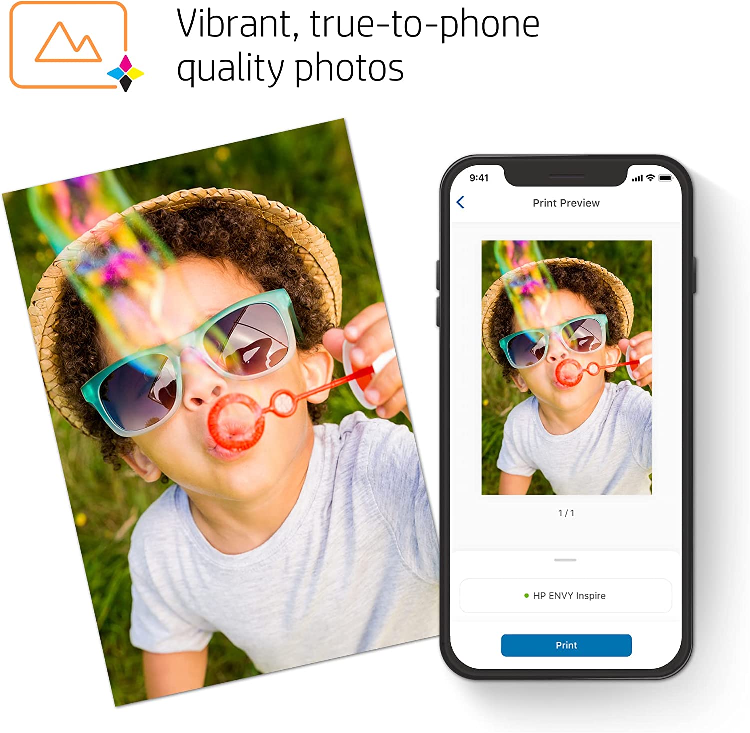 • VIBRANT PHOTOS – Photos that look as vibrant as they do on your screen with true-to-phone quality prints, plus custom photo features in the HP Smart app. HP 5x5" square and 4x12" panoramic photo paper sizes are optimized for the HP ENVY Inspire series.