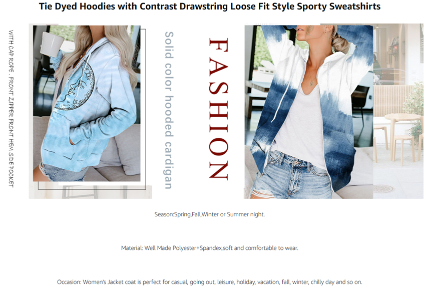 • Features: Color block,Long sleeve, Full zip up ,Tie dye,Drawstring, Striped print ,Floral print,Graphic.