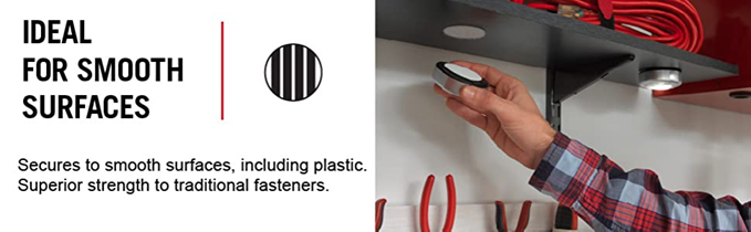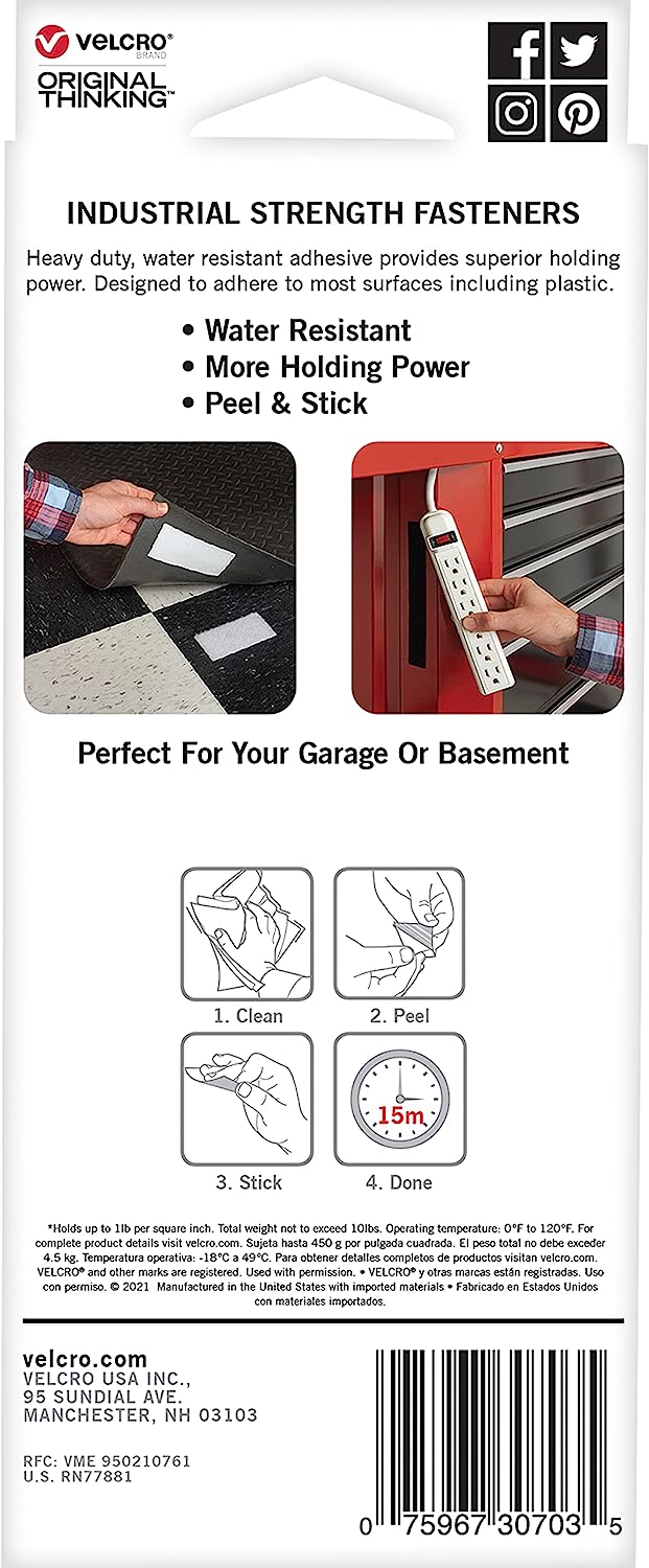 Industrial Strength Hold The VELCRO Brand Professional Grade Heavy Duty Fasteners feature a strong, superior hold for securing items indoors or outdoors. The superior holding power of these Industrial Strength hook and loop tape strips are ideal for extreme conditions and for items that require a little extra holding power. Designed for use in a wide range of indoor or outdoor applications, the range of Professional Grade Fasteners provides an easy application with the security and peace of mind that items will be safe stored, securely affixed, and protected. Choose from a Variety of Industrial Strength Hook and Loop Options Whether seasonal items need to be stored in the garage or basement, tools hung in the outdoor shed, lights affixed in the outdoor patio, or toll transponder held to a vehicles dashboard, VELCRO has the solution for your heavy duty needs for garage organization and storage and more. These fasteners are designed to maintain long-term attachment when they are infrequently opened and closed. VELCRO s Industrial Strength Fasteners provide a secure and reliable hold for use at home, office, car, garage, or anywhere a strong hold is required. Double Sided VELCRO Brand hook and loop tape are designed for heavy duty applications and hold up to 10 pounds, double sided adhesive tape strips are a versatile tool for garage storage and organization,