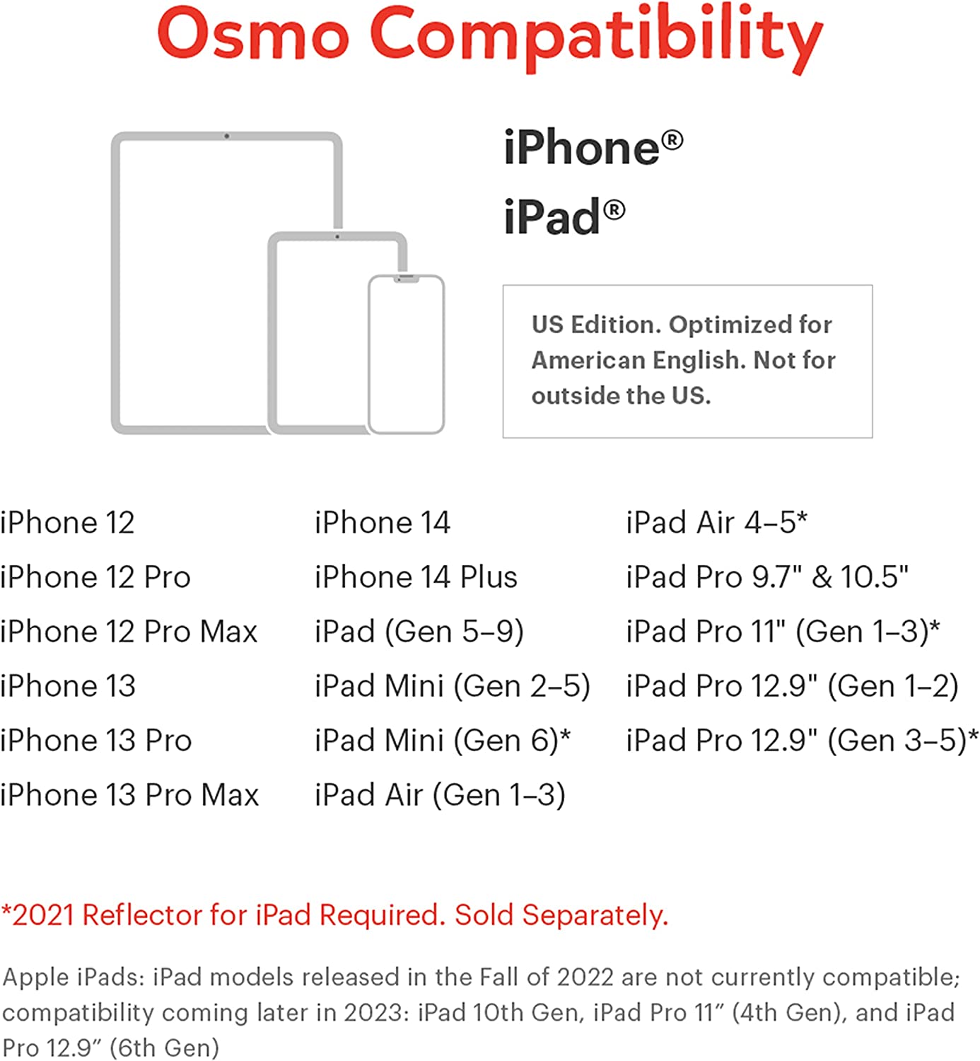 - COMPATIBILITY FOR IPAD: COMPATIBILITY FOR IPAD: All iPads except Generation 1-4. The new iPad 10th Gen, iPad Pro 11” (4th Gen), & iPad Pro 12.9” (6th Gen) are not currently compatible; compatibility coming later in 2023. iPad Reflector 2021 required for: iPad Mini 6, iPad Air 4-5, iPad Pro 11-inch & iPad Pro 12.9-inch. The minimum iOS version needed is iOS 11. COMPATIBILITY for iPHONE: iPhone 12, 12 Pro, 12 Pro Max, 13, 13 Pro, 13 Pro Max, 14, 14 Plus. No other iPhones are compatible. Requires the Osmo iPad base & 2021 reflector hardware. The minimum iOS needed is iOS 14.0.