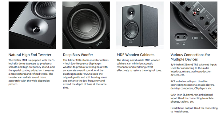 - STUDIO QUALITY SOUND – 1-inch silk dome tweeters and 4-inch composite woofers produce a clear, smooth, and overall sound. MDF wooden structure helps to reduce resonance and reveal the true sound.