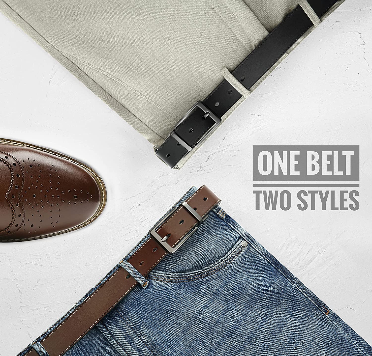 2-IN-1 VERSATILE STYLE - Pay for one but get two colors in one leather belt. The Classic design of the men’s belt is perfect to be paired with your favorite jeans, casual or dress pants. PERFECT FIT - Changing the design of the traditional double side, No-More-Screwdriver-Tools, you can easily trim to your exact size, especially for you with 33/35 waist.