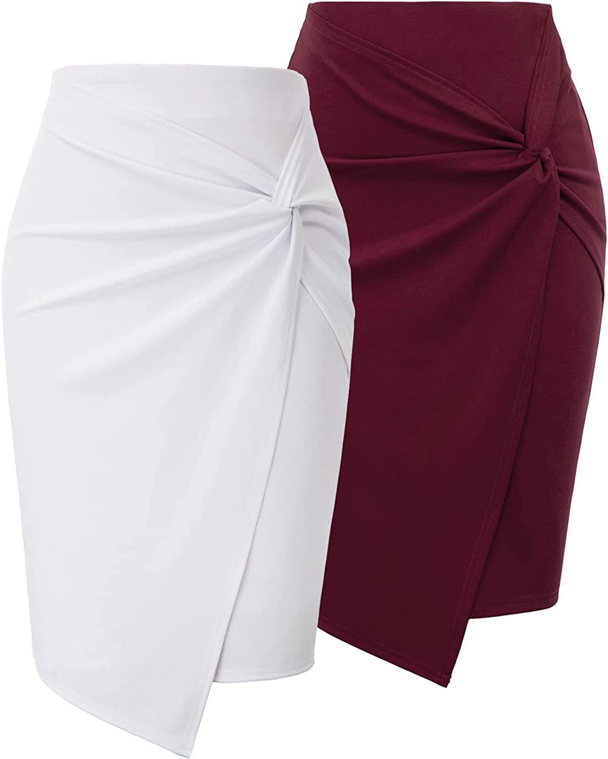 FEATURES: Asymmetrical Wrap Front with concealed zipper in the back.Well elastic pencil skirt