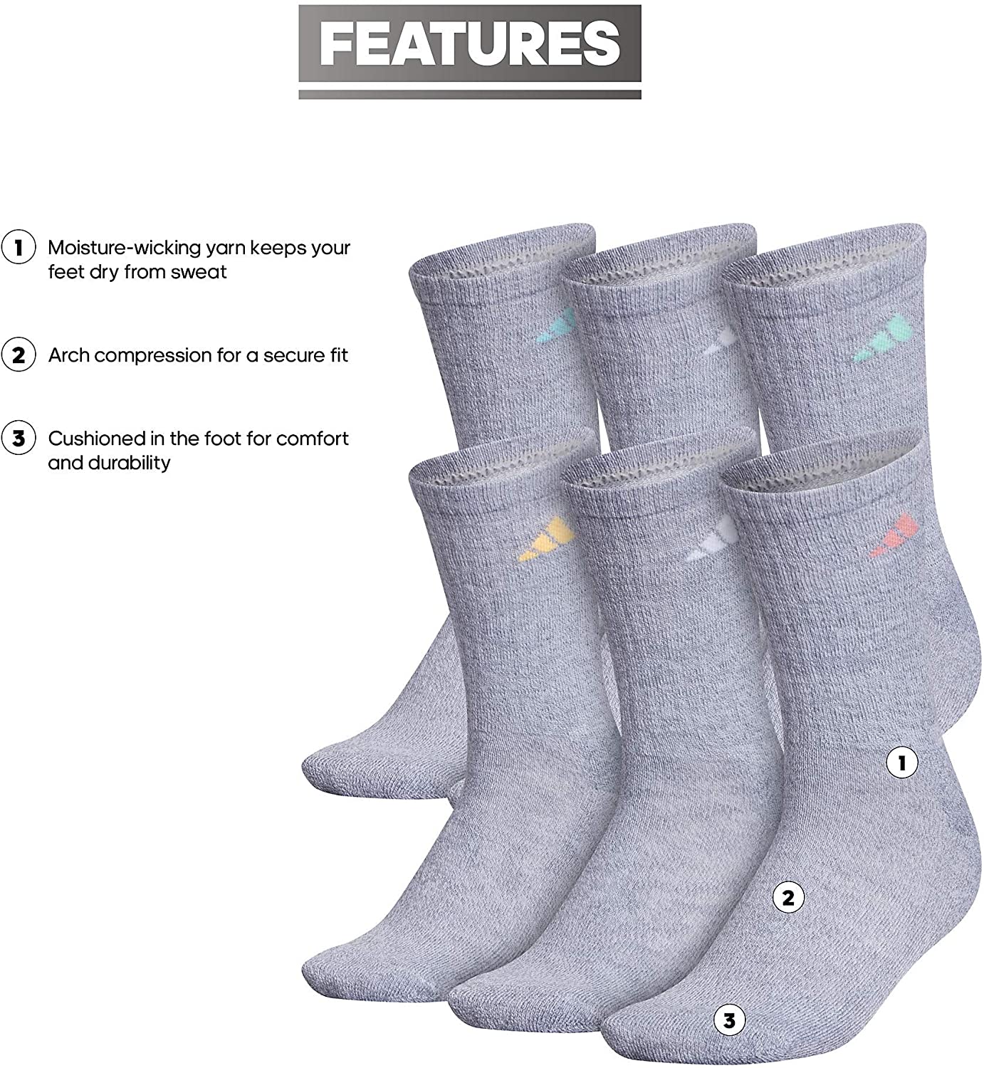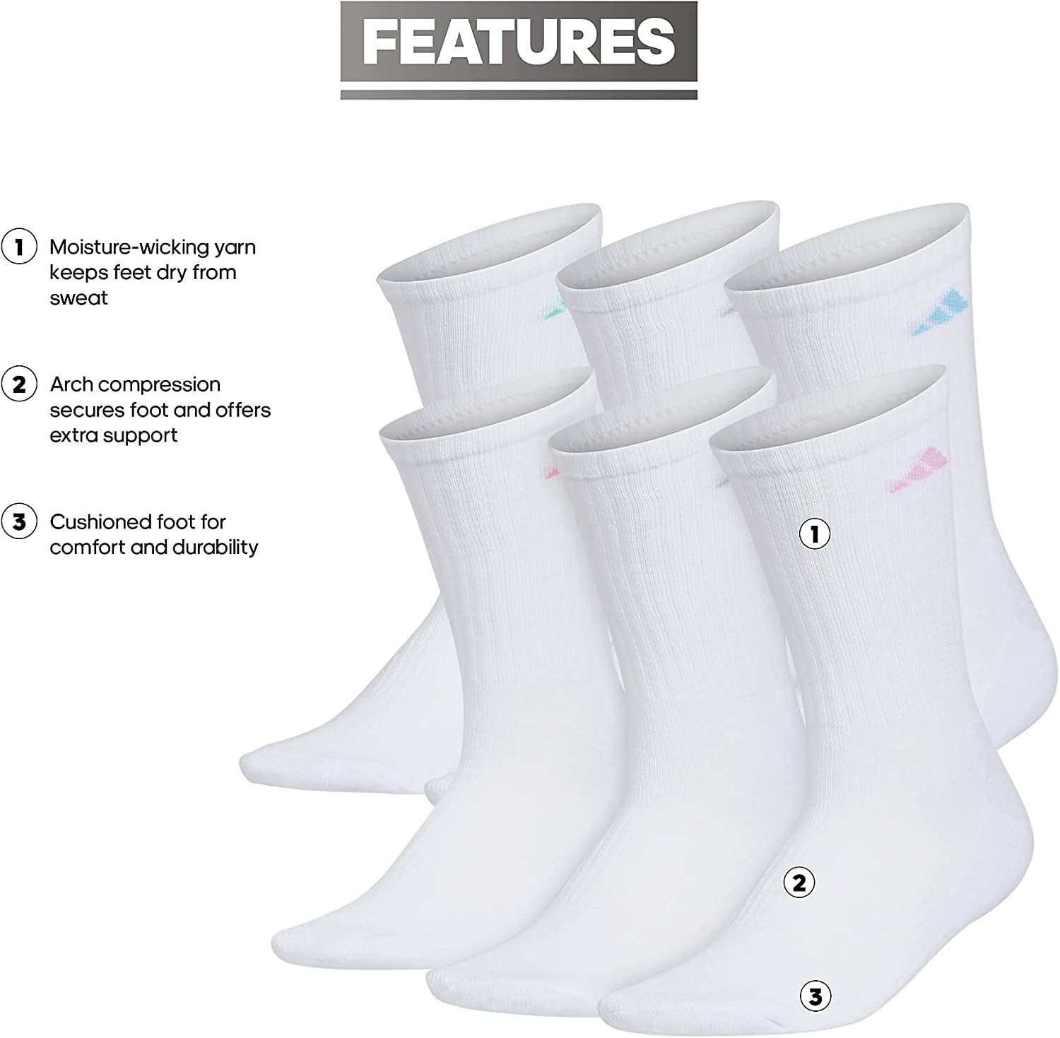 adidas Women's Athletic Cushioned Crew Socks (6-Pair) with arch compression