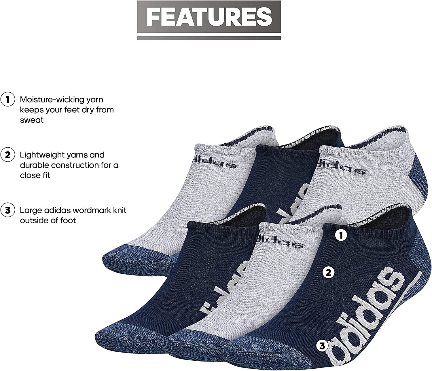Keep your look sleek and streamlined while you work out. These no-show socks have a lightweight, barely-there feel. Moisture-wicking yarn keeps feet dry when you raise the intensity. A knit-in adidas logo stands out on the outside of the foot.