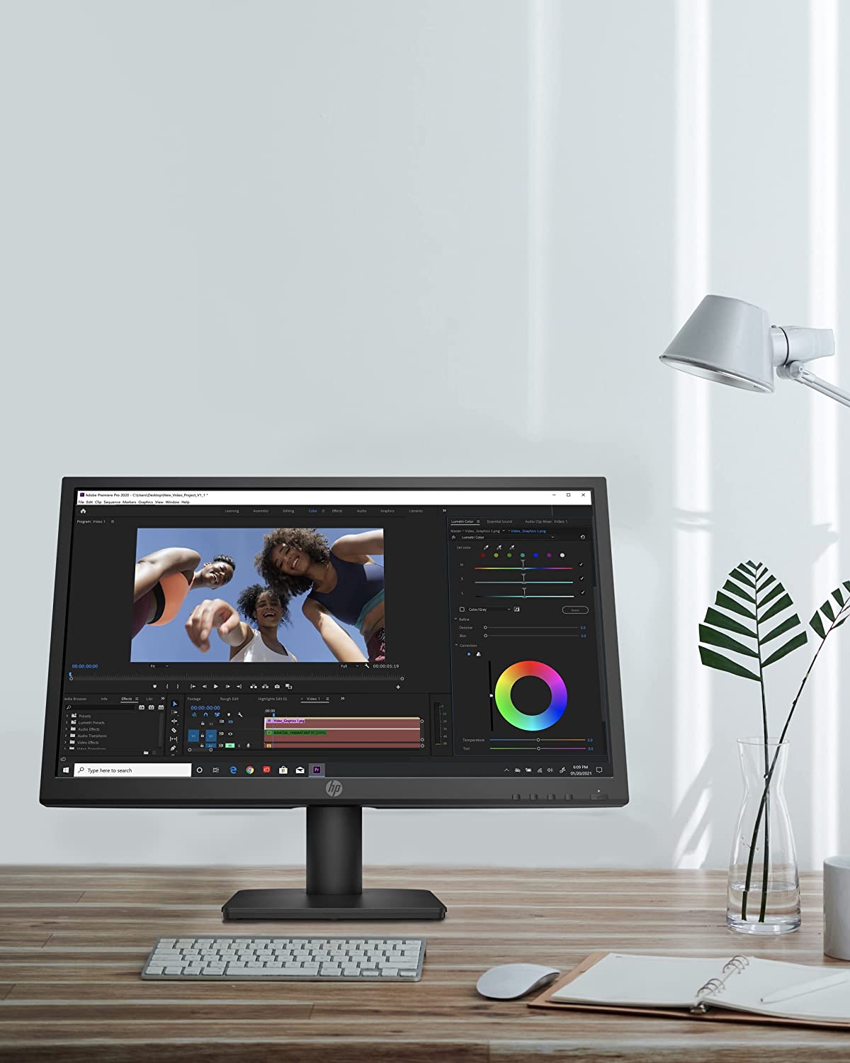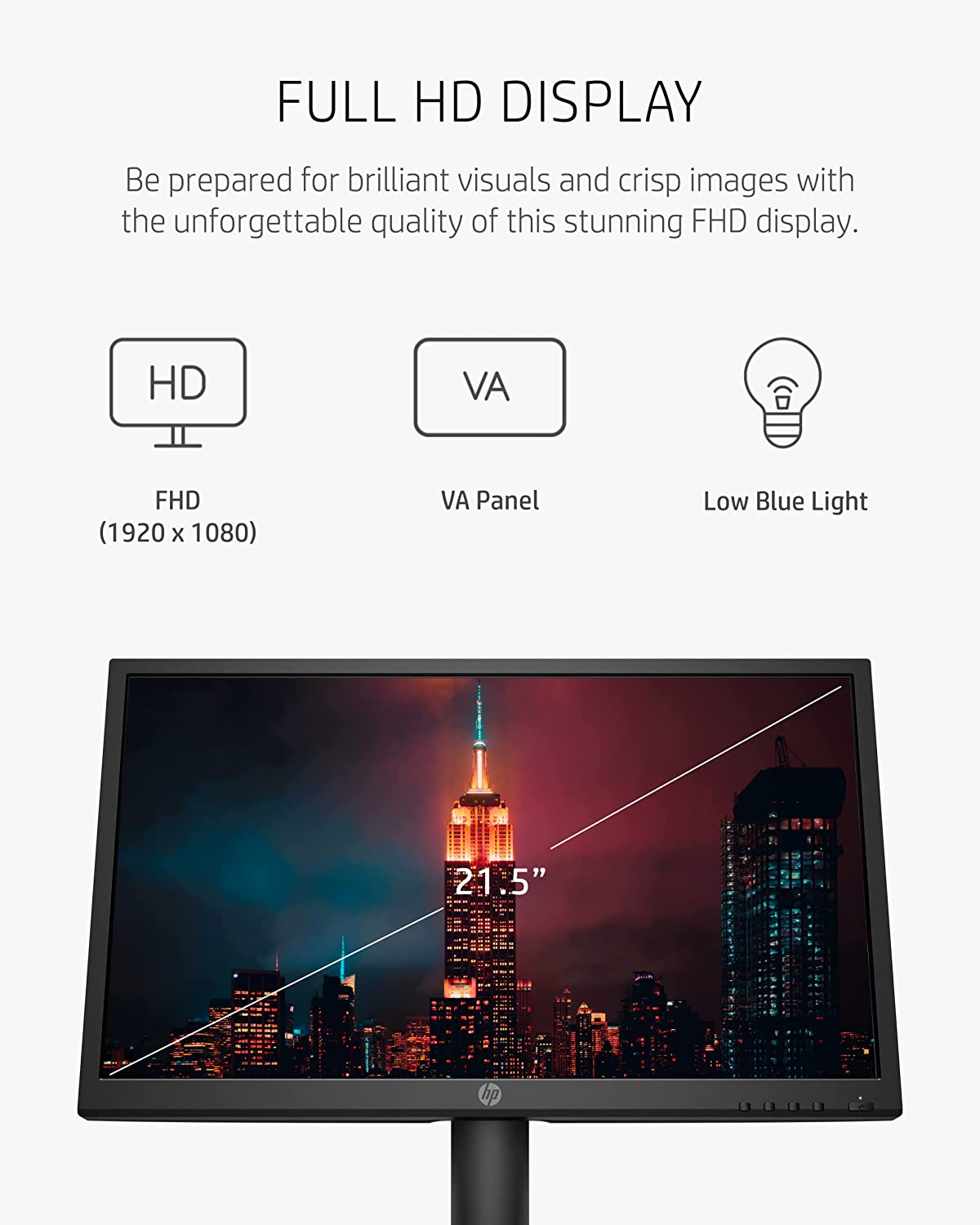 Browse the web, stream your shows, and get work done on the everyday HP V223ve FHD Monitor. This HP computer monitor’s 21.5-inch Full HD screen boasts unparalleled visuals every time you turn it on (1). What’s more is that the 1080p monitor features a 75Hz refresh rate for smoother images, plus a superb contrast ratio for better color differentiation (2). No matter where you view your HP monitor, the VA panel ensures image clarity is maintained across ultra-wide 178-degree horizontal and vertical viewing angles. Easily connect a laptop, an external storage drive, or an additional monitor with the HDMI and VGA ports. Get the most out of a PC monitor designed for both comfort and efficiency. The TÜV certified Low Blue Light Mode limits the strain put on your eyes, while the tilt-adjustable display ensures comfortable posture all day. Beyond this HDMI monitor’s comfort settings, the narrow bezel design keeps things stylish and productive, letting you see more of your favorite show or word document. Customize your display with ease thanks to the intuitive HP Display Center software; through the host PC, you can personalize every little detail from display settings, screen partitioning, and even dimming the screen. Further customize the way you use this monitor with standard 100 x 100 millimeters VESA mounting options (3). This 75Hz monitor’s energy-efficient design isn't just for you but the environment too, as your device reduces power consumption and energy costs. Plus, the materials used in the packaging are 100% sustainably sourced and recyclable (4). Rest easy as your monitor is covered by an HP 1-year limited hardware warranty. (1) Full high-definition (FHD) content is required to view FHD images. (2) During video playback only, depending on series of frames or time duration. (3) Bracket not included. (4) 100% outer box/corrugate cushion packaging made from sustainably sourced certified and recycled fibers. Fiber cushions are made from 100% recycled wood fiber and organic material. Excludes plastic bags and plastic foam sheeting. 06/04/2021_r1 tg.