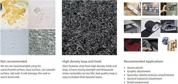 • Recommend: Securing fabric to furniture cushions. Point of purchase display and signage. General industrial applications. Marine and specialty vehicle applications. Alternative solutions for zippers, screws, buckles, etc. Car carpet and home floor mat and other stuff fixation. (Please note the sticky back side is acrylic coated tissue paper, sometimes it will have a little residue after peel off duty to the strong adhesion)