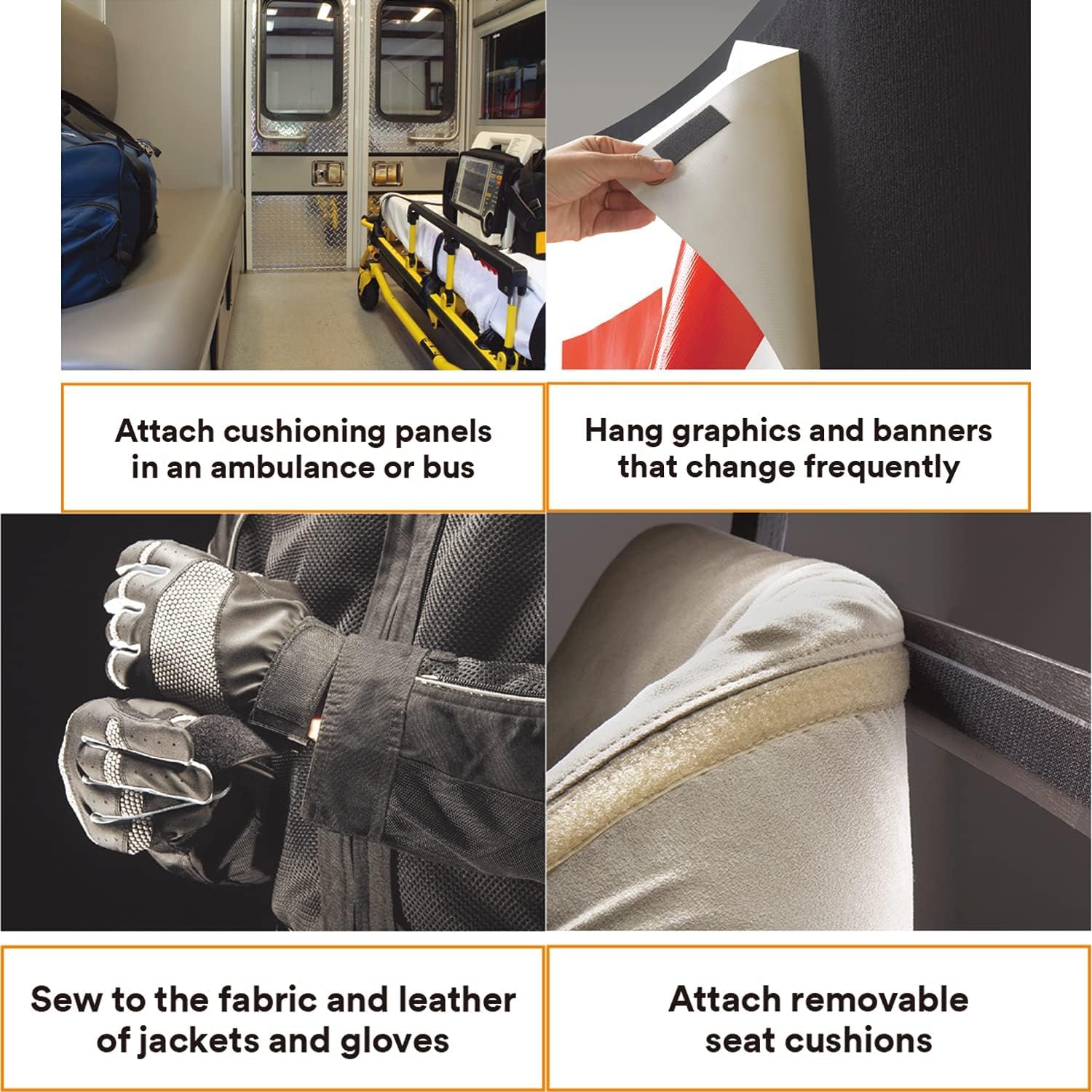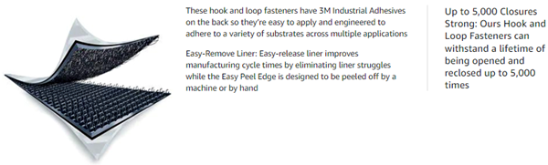 • Repeated Closures: This Hook and Loop Strip Fasteners offer great design flexibility, fast product assembly, smooth and clean exterior surfaces and excellent product performance in many applications. Hook and Loop Fasteners consist of hooks and loops which engage to form a quick fastening attachment. To disengage the attachment, simply pull the strips apart by hand.