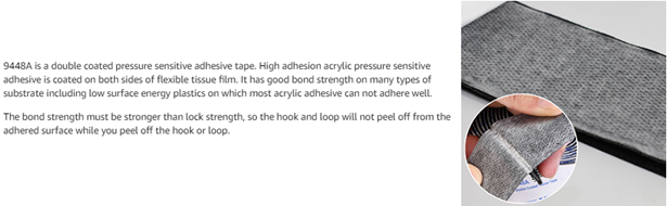 • Data View: Name: 9448A back side hook and loop tape. Color and material: Black nylon. Size: 2in(50mm) width 3m(10ft) length. Lock strength: 30N(1in x 2in sample). Sticky side adhesion strength: 110N(1in x 2in sample). Long term temperature resistance: 93°C(158°F), short term temperature resistance: 149°C(300°F).