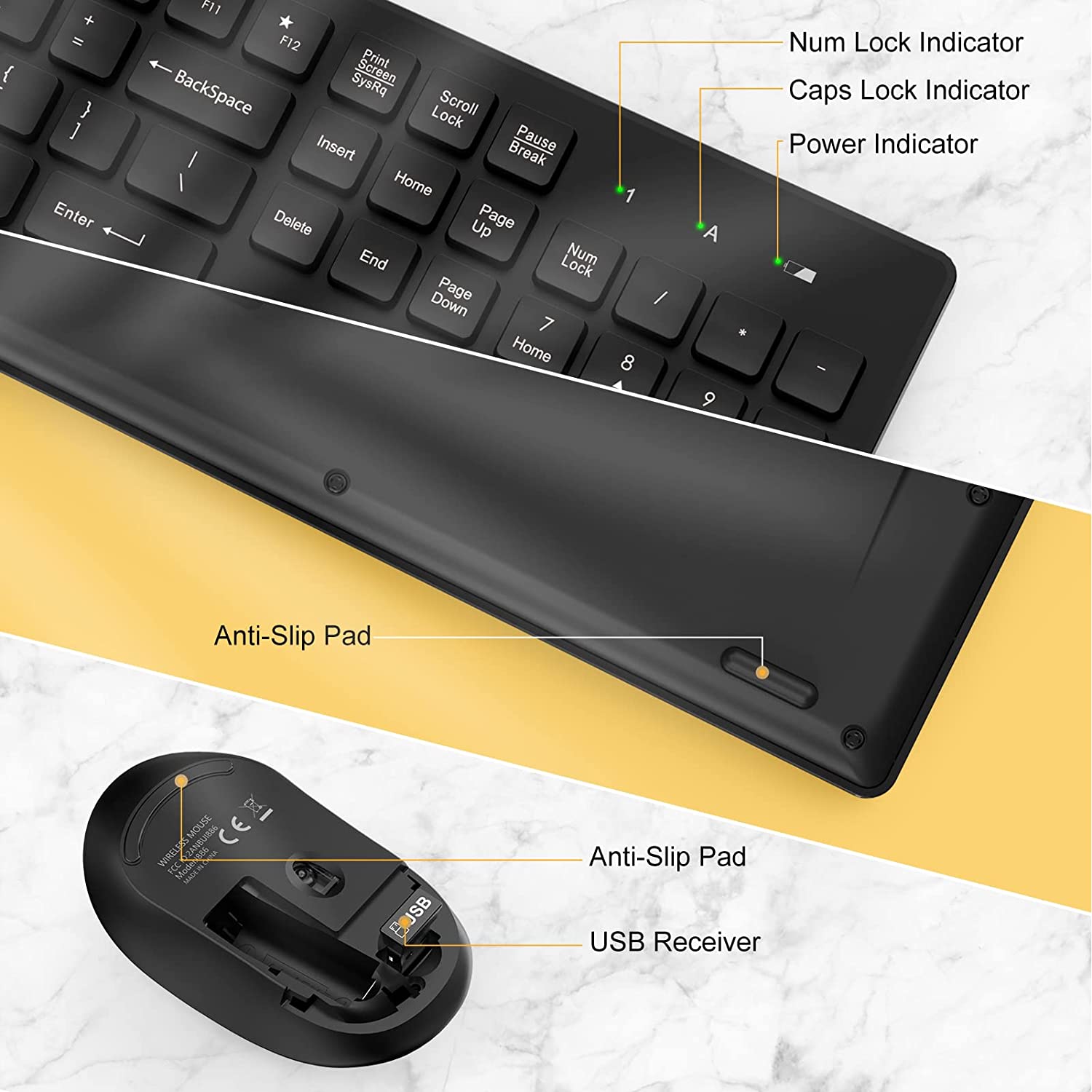 【Lag-free, Plug & Play】2.4GHz wireless technology provides automatic frequency recognition and stable signal, plug and play, connection range up to 33ft without any delays. Cut the cord and enjoy the freedom.⚠️【Note】Keyboard and mouse share a receiver, which is stored in the mouse. ⚠️TWO VERSION SHIPPED RANDOMLY⚠️Only the characters on the keyboard are slightly different, but the function is the same.
