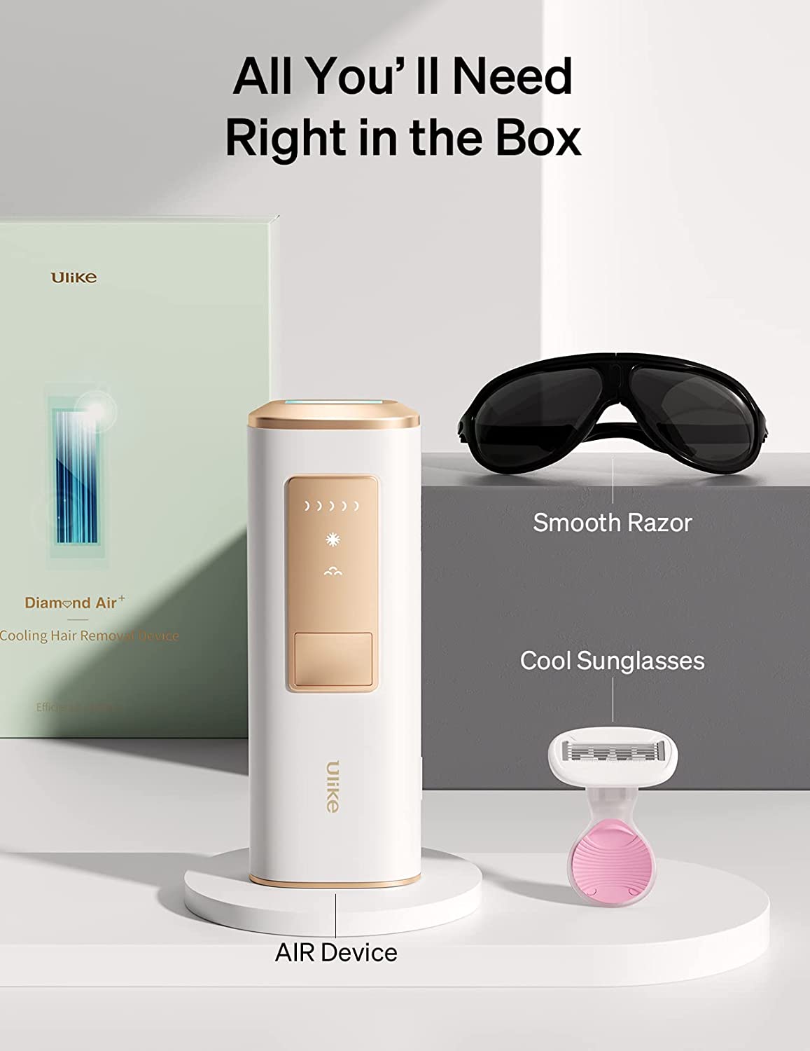 What’s in the Box - Get fantastic results right from your sofa. Ulike Sapphire Air includes the Device, Razor, and Sunglasses. It’s all you’ll need to look and feel your best throughout the seasons.