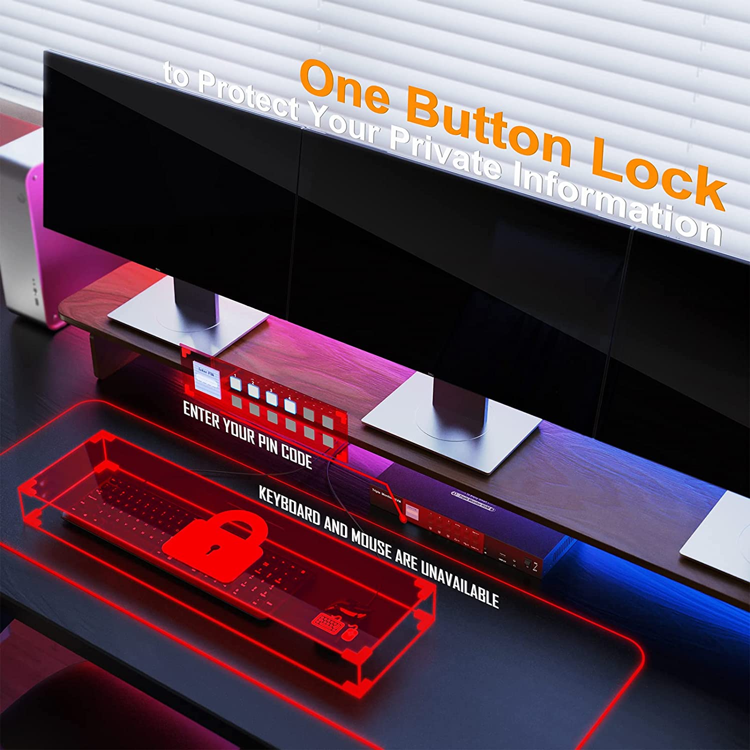 【Protect Your Private Information】 Just press the lock button to lock the KVM and protect your private information when you temporarily leave your desk. After locking, all displays will be off, audio output will be paused, and LCD screen brightness will be reduced to a minimum, all buttons will be invalid. You can enter the password to unlock when you come back.