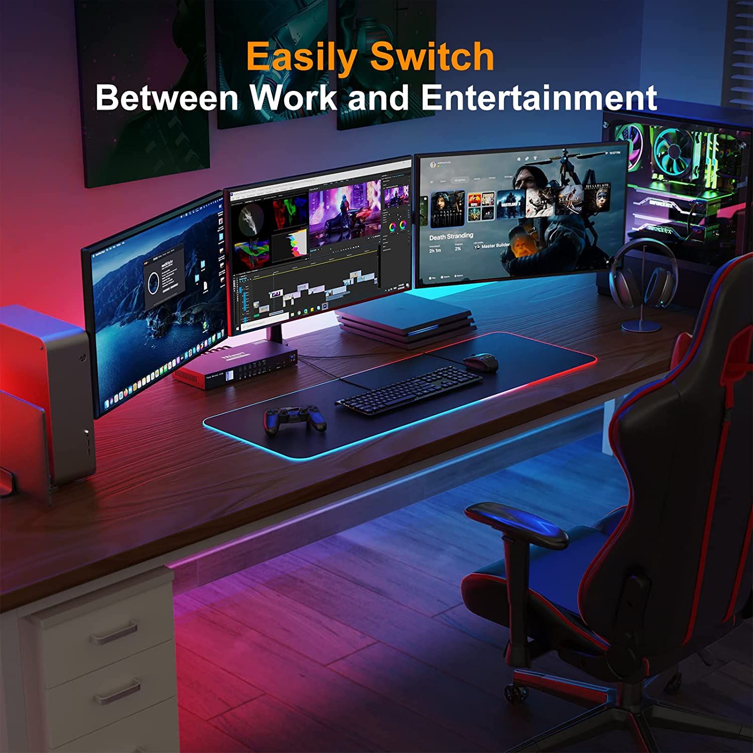 【TRIPLE MONITOR KVM SWITCH WITH 2 DISPLAY MODES】Hooking 4 desktops or Laptops to share one set of keyboard, mouse and 3 monitors for extended display or duplicate display or display different PCs on 3 monitors. Each computer needs to have 3 video connection to the triple monitor HDMI KVM.