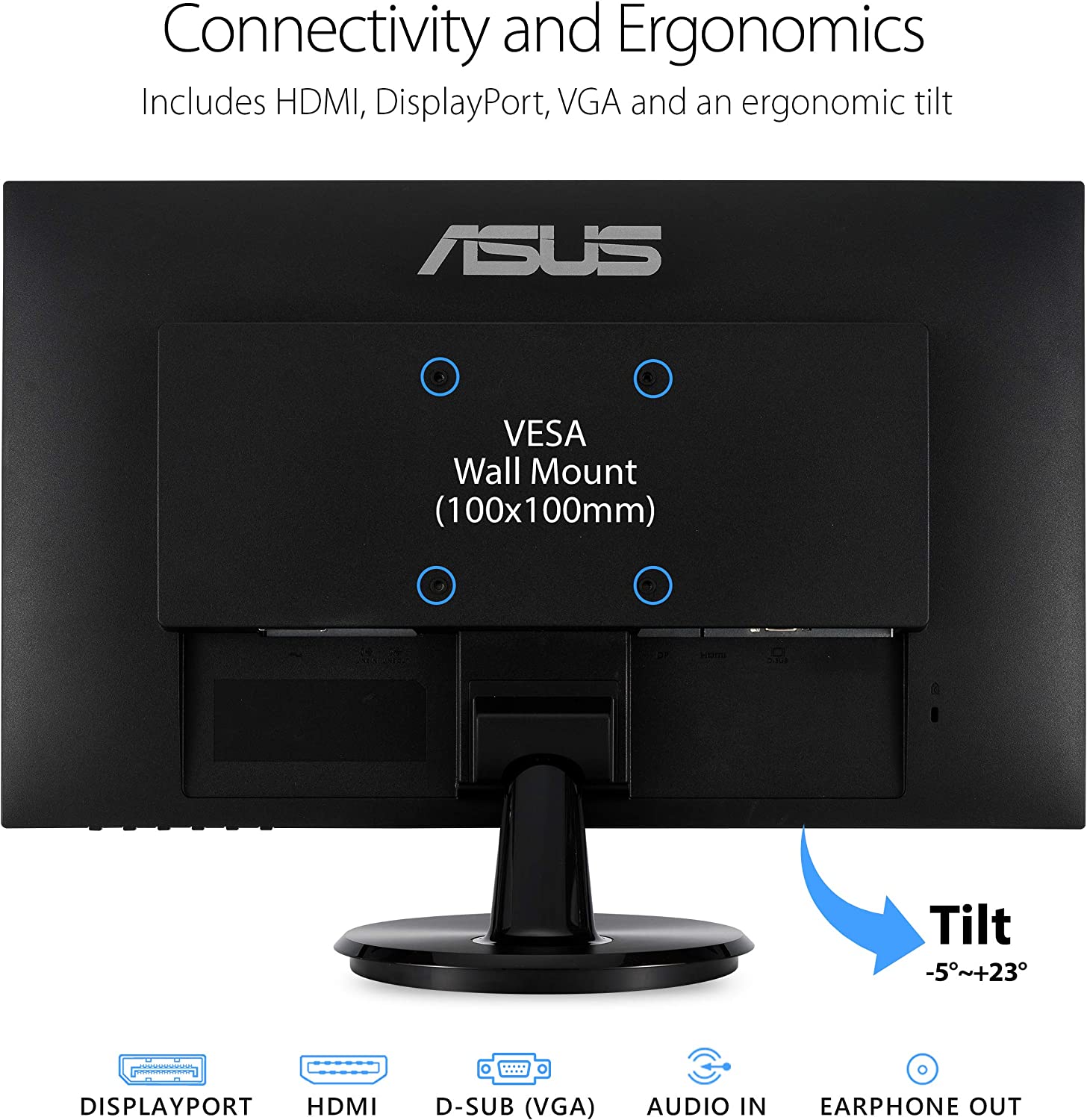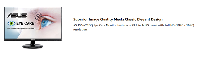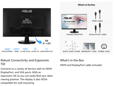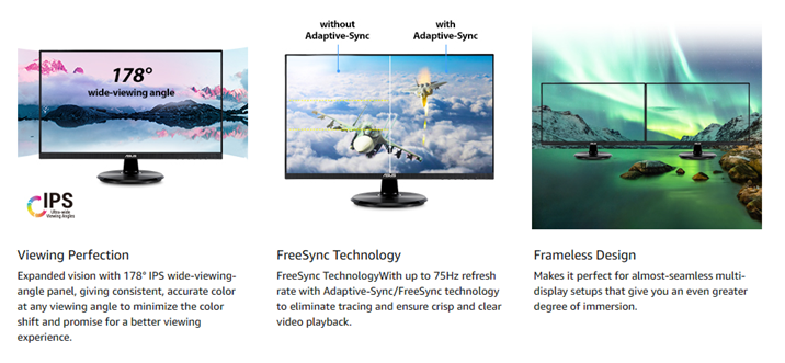 The 23.8” Full HD VA24DQ monitor features a gorgeous IPS panel with 178° wide viewing angle. Enjoy up to 75Hz refresh rate and Adaptive-Sync/FreeSync™ technology for crisp and clear video playback and frameless bezels for an immersive experience. Sit comfortably with an adjustable tilt of +23°~-5°.