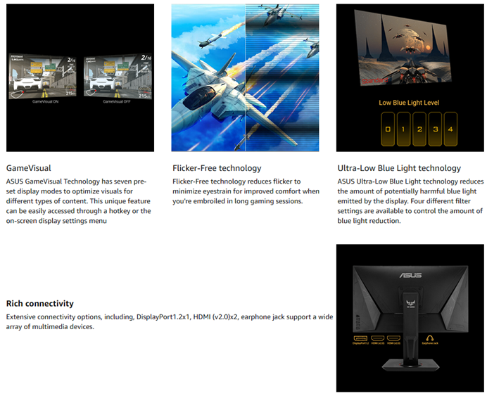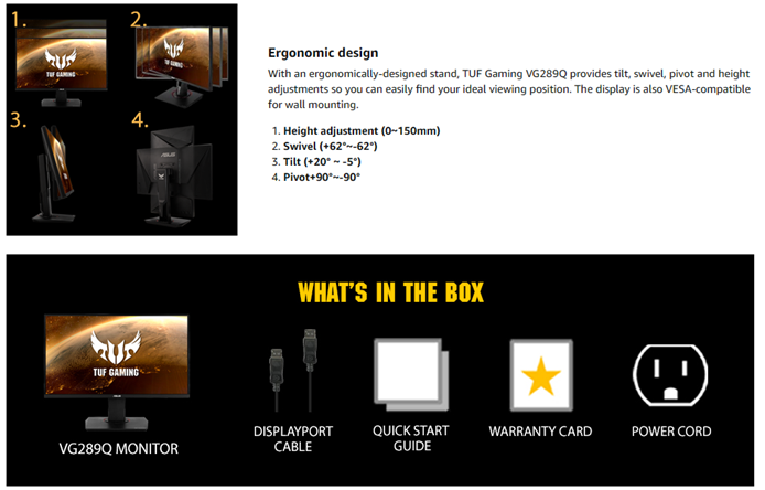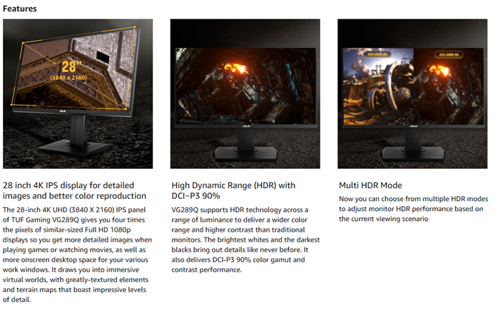 Enabling the finest visuals in every gameplay the TUF Gaming VG289Q features a 28-inch 4K UHD IPS display with superior images and 90% DCI-P3 color space Eliminate screen tearing and choppy frame rates with FreeSync and Adaptive-Sync technology and catch your enemies even in the dark with ASUS-Exclusive Shadow boost technology.