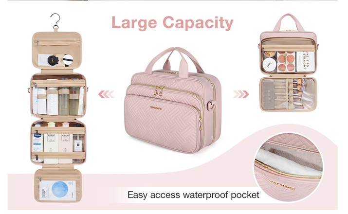 Special Design - 1 front zipper pocket for storing makeup brushes and cosmetics. Detachable shoulder strap provides a variety of ways to carry. Stow-away 360 degree swivel non-slip metal hook for versatile hanging options.