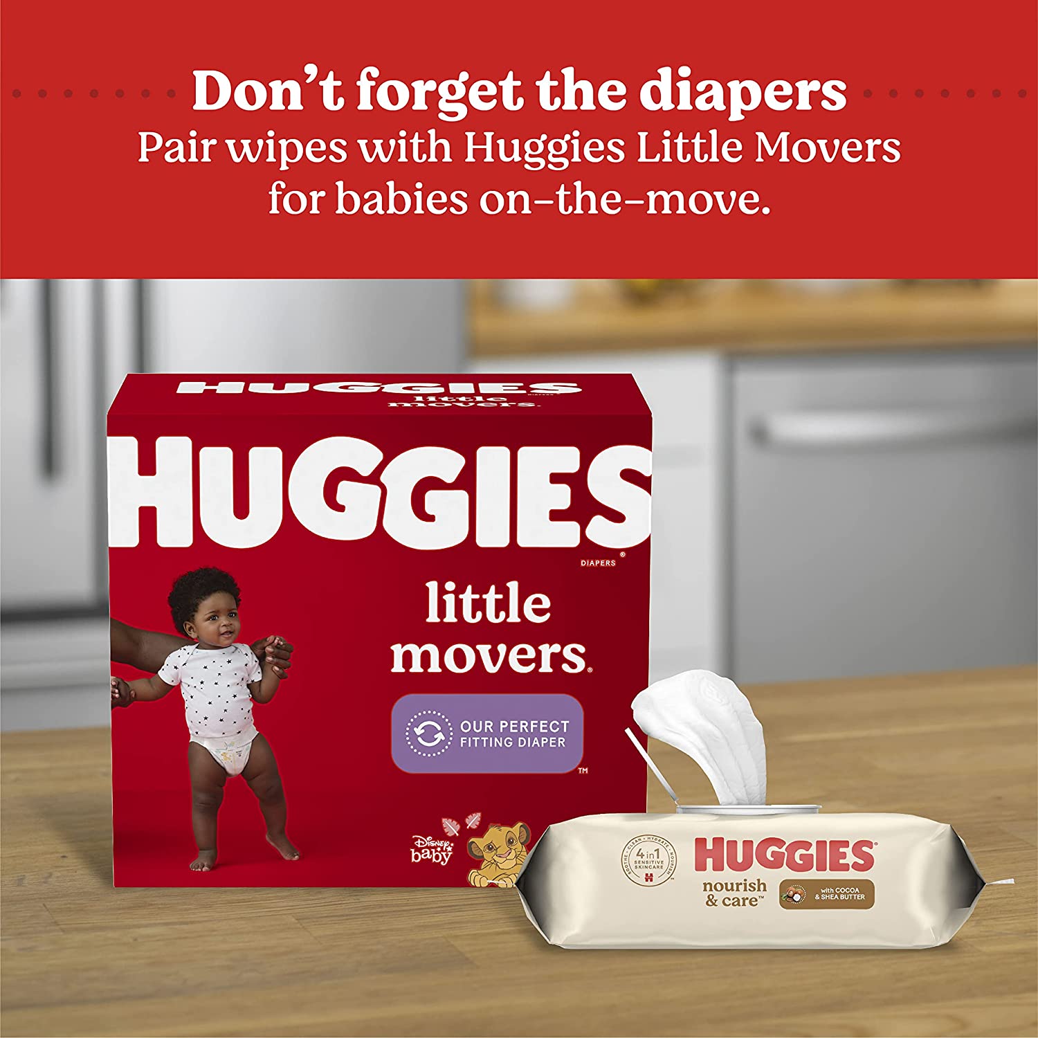 Clean, hydrate, nourish, and sooth your baby's delicate skin with the 4 in 1 Sensitive Skincare of Huggies Nourish & Care Baby Wipes. These scented wipes are 20% thicker** for a cloth-like feeling and infused with cocoa and shea butter ingredients to clean and moisturize with every wipe. Offering you plant-based ingredients for over 20 years, these baby wipes are , dermatologist-tested and pH-balanced to help maintain healthy skin. They're also alcohol free, paraben free and do not contain phenoxyethanol or MIT, so you can feel confident you're giving your baby soft, smooth skin with every wipe. Plus, with a push-button design and EZ Pull 1-Handed Dispensing, you can easily grab wipes without wasting sheets. Join Huggies Rewards+ powered by Fetch to get rewarded. Earn points on Huggies diapers and wipes, in addition to thousands of other products to redeem for hundreds of gift cards. Download the Fetch Rewards app to get started today! (*70%+ by weight ) (**compared to Huggies Natural Care Baby Wipes)
