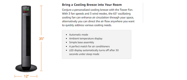• 65° Oscillation For Wider Air Distribution: Coming with a 65° oscillation feature, the tower fan is able to offer a wider airflow and increase its cooling effects, so it can provide a refreshing experience to your entire family. For even better results and less energy waste, you can pair your fan with your air conditioner to accelerate the air ventilation and attain a more balanced room temperature.