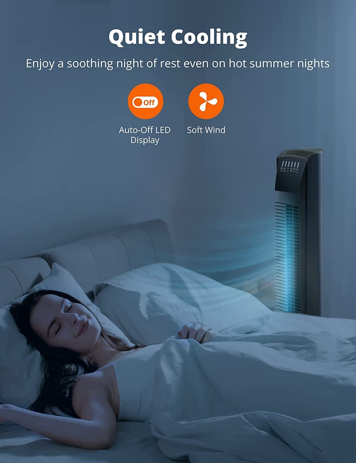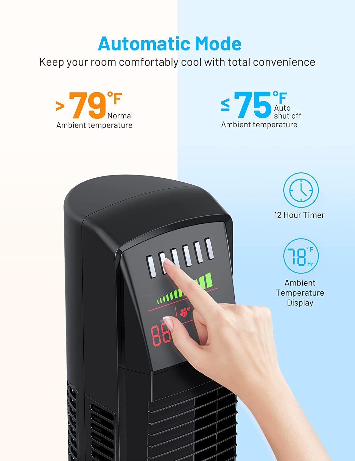 • How many times have you wished you could turn on or off your fan in the middle of the night without having to leave your bed? Now you can! Activate auto mode for the tower fan to run while the ambient temp is over 79°F and auto shuts off when less than 75°F, you’ll always inhabit a pleasant and healthy space.