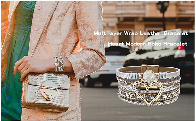 Long tiantian Multilayer Wrap Leather Bracelet Heart Modern Boho Bracelet with Magnetic Clasp Cuff Rhinestone Leather Bracelets for Women