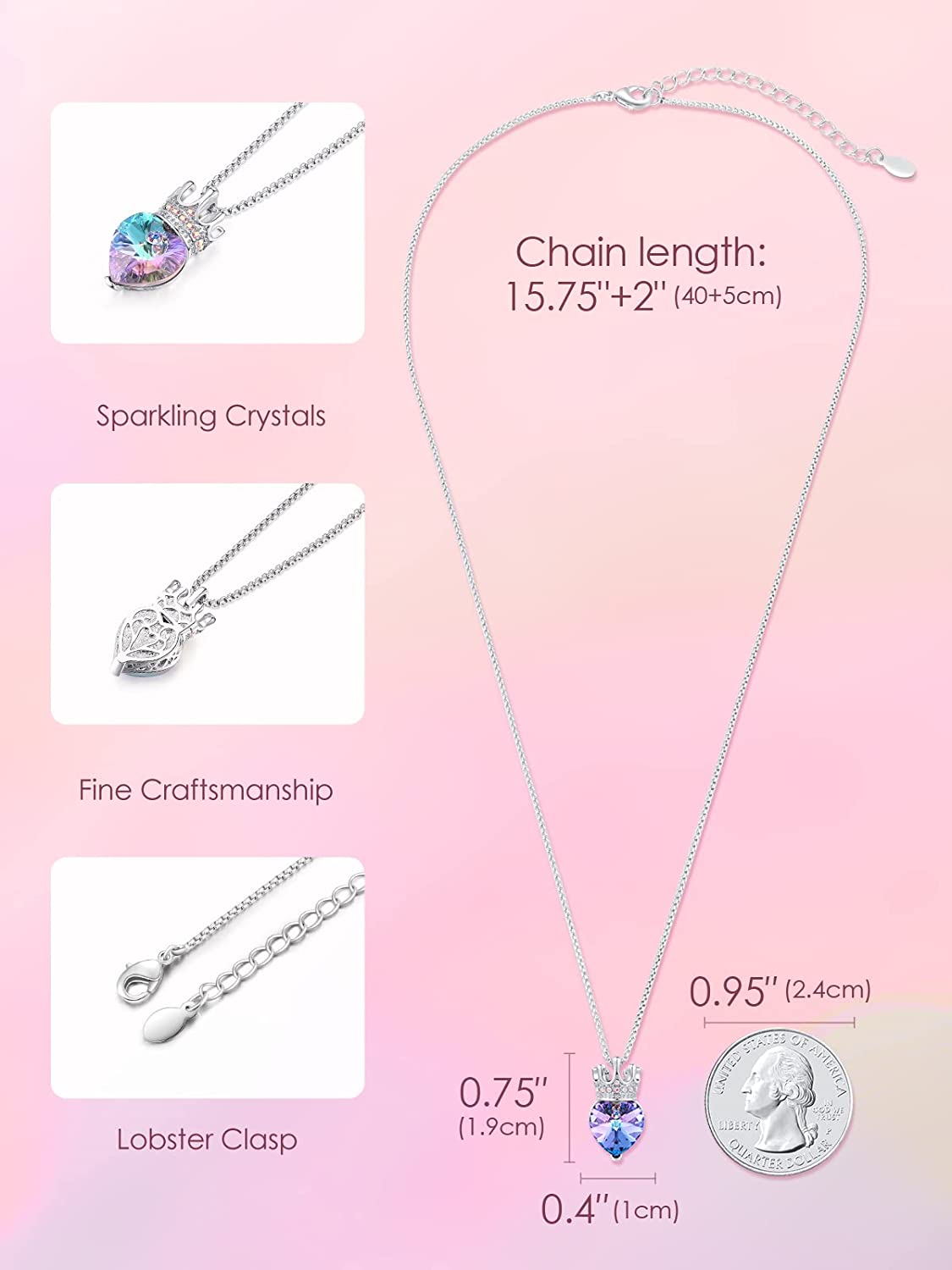 DAINTY NECKLACE’S SIZE: This 0.75”×0.4” heart pendant is sweet and exquisite for little girls. The crown pendant has a 15.75”+2” adjustable chain and can be worn as a clavicle necklace at birthday party, dance, dinner or family gatherings.