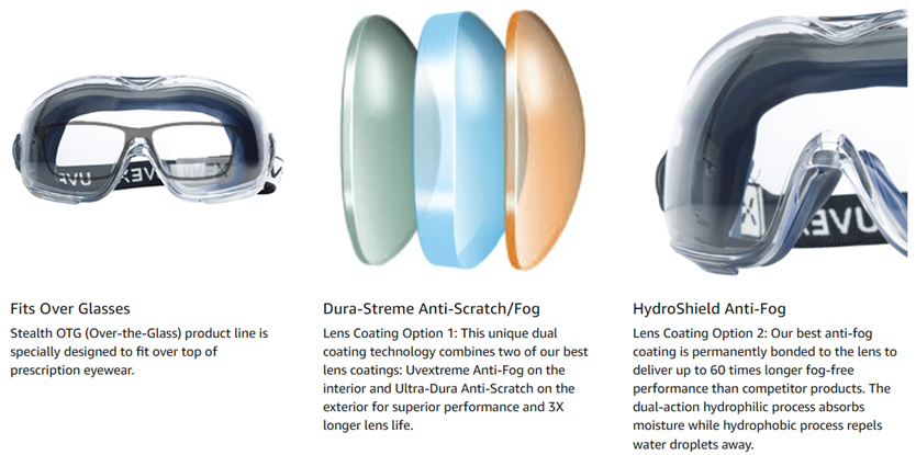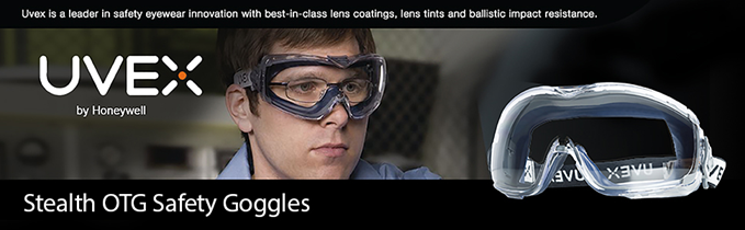 Protect your eyes with Uvex Stealth OTG Safety Goggles. Specially designed to fit over prescription eyewear, the Stealth OTG (Over-the-Glass) design features a soft, elastomer body that flexes and conforms to the face for a secure, comfortable, gap-free fit. This ensures protection against impacts, dust, airborne particles and chemical splashes. The clear lens offers excellent optics in any work environment. The HydroShield coating features dual hydrophilic and hydrophobic properties that keep lenses clear up to 60 times longer than our next best coating. The pivoting, quick-adjust fabric headband allows for a customized fit and long-wearing comfort. Lens replacement is easy and economical. Meets ANSI Z87.1-2003 and CSA Z94.3 standards.