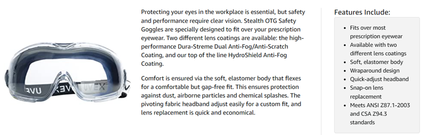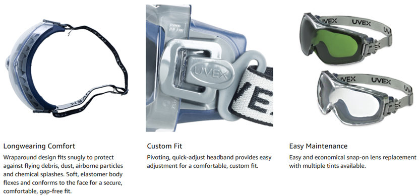 • PLASH & IMPACT PROTECTION: Gap-free fit protects eyes from splashes, mists, dusts etc; low-profile design reduces chance of snagging; frame and lens are both impact-resistant for workplace safety; meets ANSI Z87+ and CSA Z94.3; made in the U.S.A