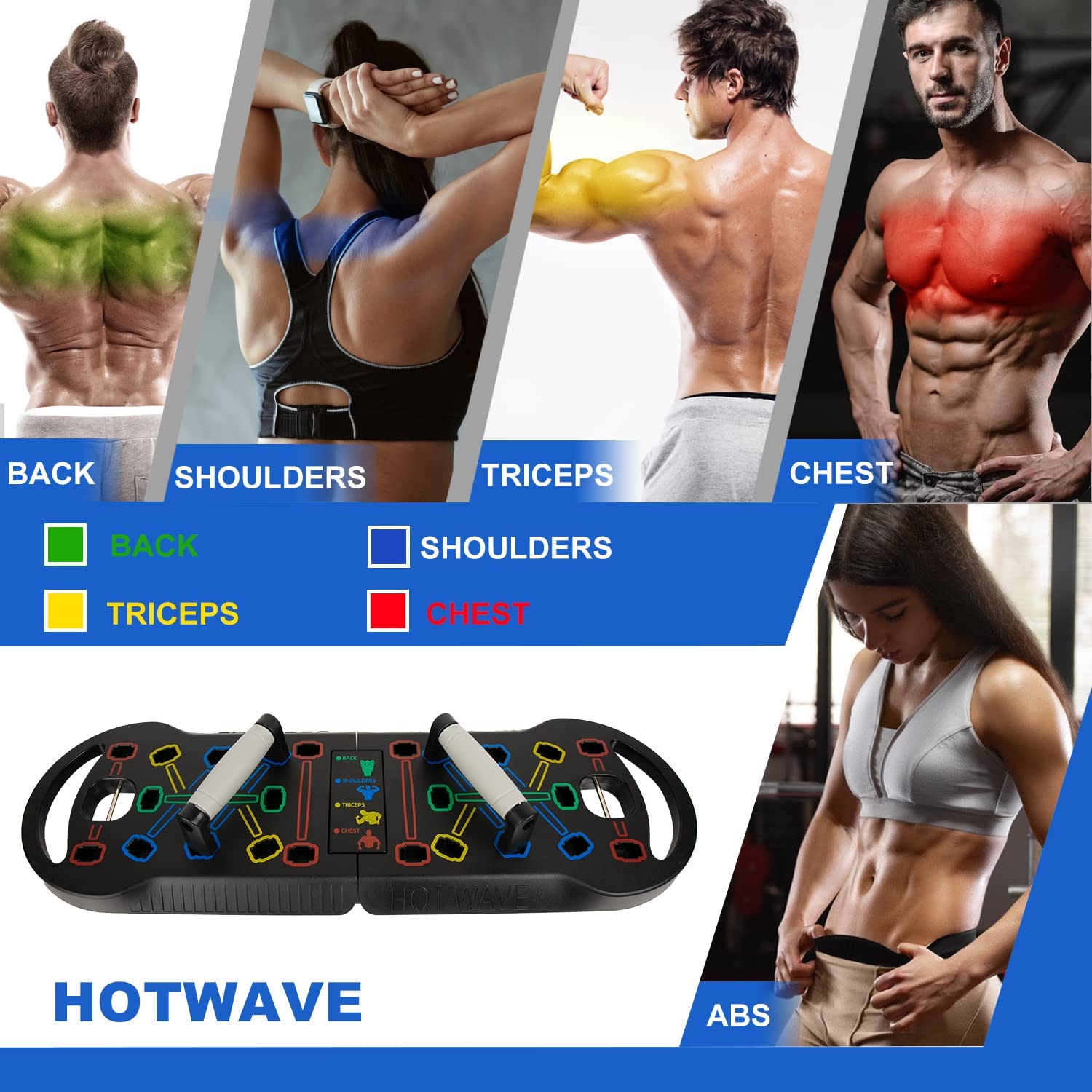 - 【UNIQUE PUSH UP BOARD】Upgraded Push up bar specifically designed to target different muscle groups (chest, shoulder, abs, biceps, back) , HOTWAVE Provide multiple combination positions to mix and match various color postures to get more pushups angles and detailed instructions is provided with professional training guidance for maximizing your full body work out,make muscle training more professional and effective.