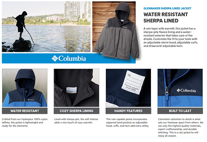 - BUILT TO LAST: Columbia’s attention to detail is what sets our footwear apart from others. We use only the highest quality materials, expert craftsmanship, and durable stitching. This is a rain jacket he will enjoy all season