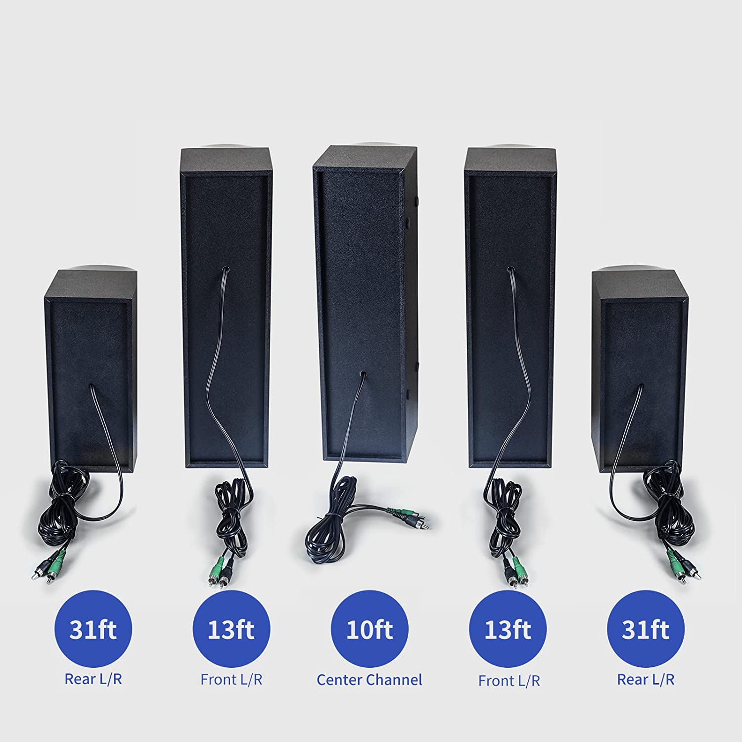 - Long Built-in Cable Connection: Wired connection between the small speakers and the subwoofer(not wireless), with long enough built-in cable, the speakers can be placed anywhere: Front Speakers L/F: 13Ft, Rear Speakers L/R: 31Ft, Center Speaker: 10Ft