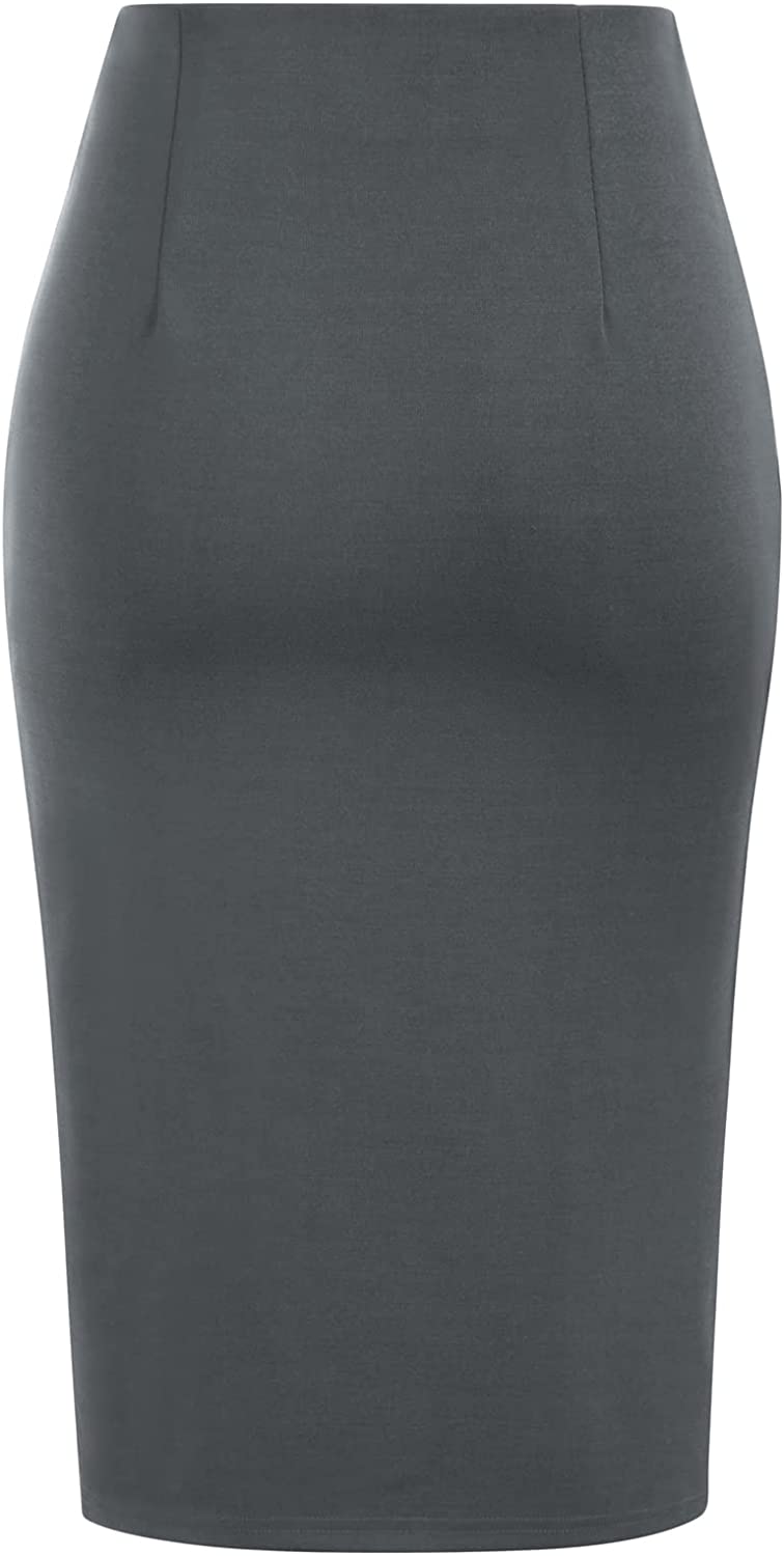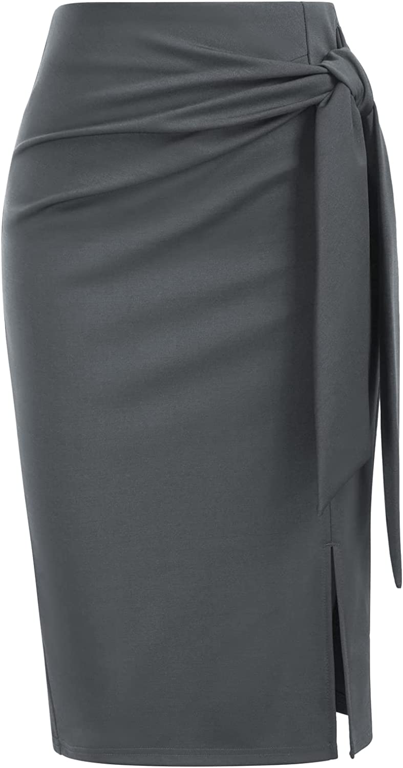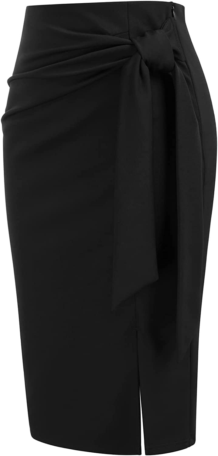 Kate Kasin Women's Skirt Elastic High Waist Bow Tie Knee Length Stretch Bodycon Pencil Skirts with Slit