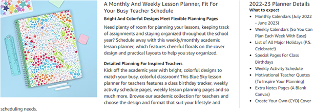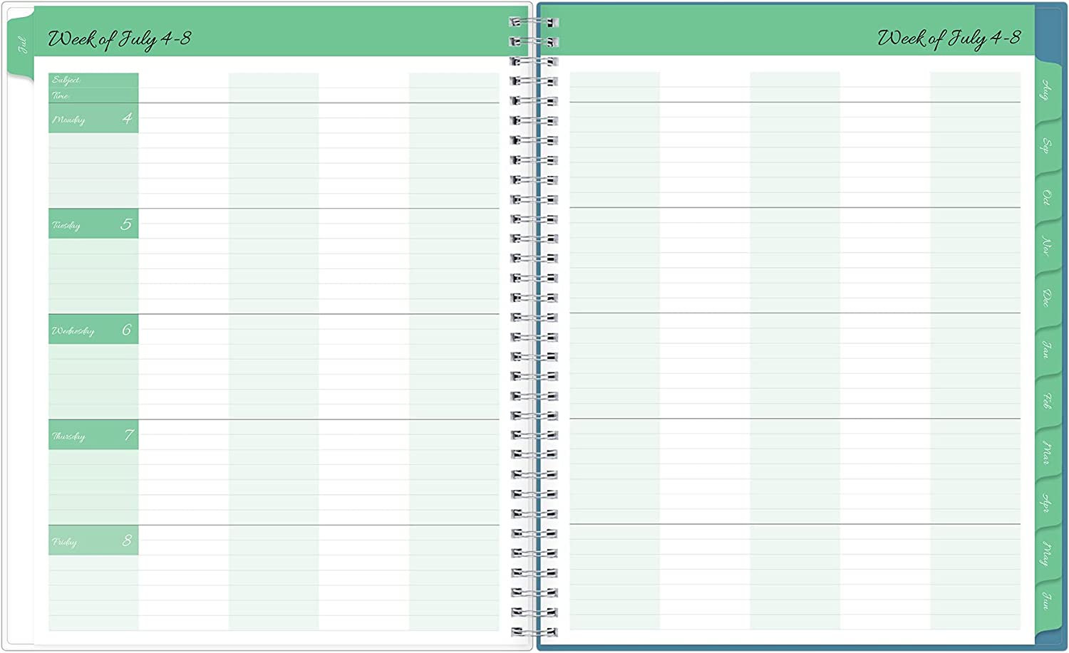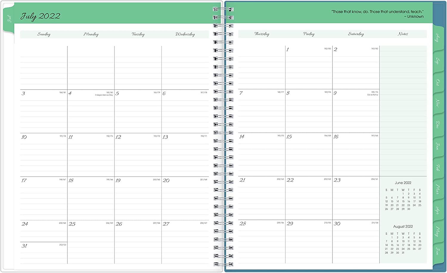 Kick off the academic year with bright, colorful designs to match your busy, colorful classroom! This colorful weekly and monthly lesson planner will help you stay on track throughout the school year with dated weekly/monthly views. Monthly two-page view features reference calendars for long-term planning, a notes section for important details, and motivational teacher quotes to inspire your planning. Weekly two-page view offers lesson planning layouts with ample writing space for detailing each day. With a class birthday tracker, weekly activity schedule pages and weekly lesson planning pages, this yearly planner offers so much more than your average planner. Insert your favorite photos inside the glossy, clear front sleeve cover for a unique planner cover. High quality white paper provides clean writing space for jotting down your appointments, to-dos and reminders. Durable coated tabbed dividers are long lasting and make accessing information a breeze. Premium quality covers and twin-wire binding provide reliable durability for daily use. Stay on track throughout the academic year with this large 8.5 x 11 lesson planner dated July 2022 - June 2023. Mix and match with other planning products from Blue Sky to organize your daily life. Blue Sky creates modern and sophisticated organizational planners and calendars to fit the scheduling needs of busy people - whether it’s for business professionals, college students, teachers, or anyone with appointments to make note of. Keep your life organized with our full line of products including desk pad calendars, wirebound tabbed weekly and monthly planners with contacts and notes pages to accommodate your scheduling needs, and laminated two-sided wall calendars, all in a variety of colors and patterns to suit your lifestyle and personality.