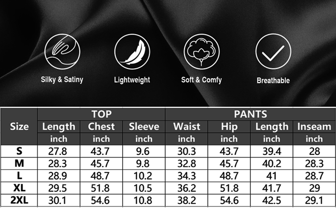 - SIZE AND CARE: Men silk pjs set can be machine or hand washed. Hang to dry. Do not iron or bleach at high temperatures. Our size is standard US size, please refer to the size chart before ordering