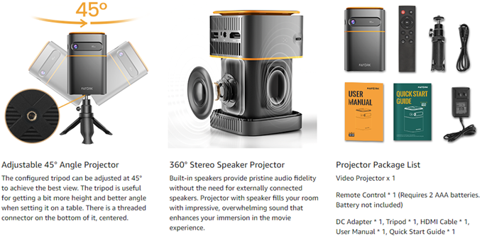 • ?【CUSTOMER SERVICE SUPPORT】: FATORK has always been committed to providing excellent pocket projectors and 100% satisfied customer service. We provide 12 months of professional after-sales service and permanent professional technical support. If you have some problem, please contact us on Amazon, and we will try our best to solve it for you within 24 hours.
