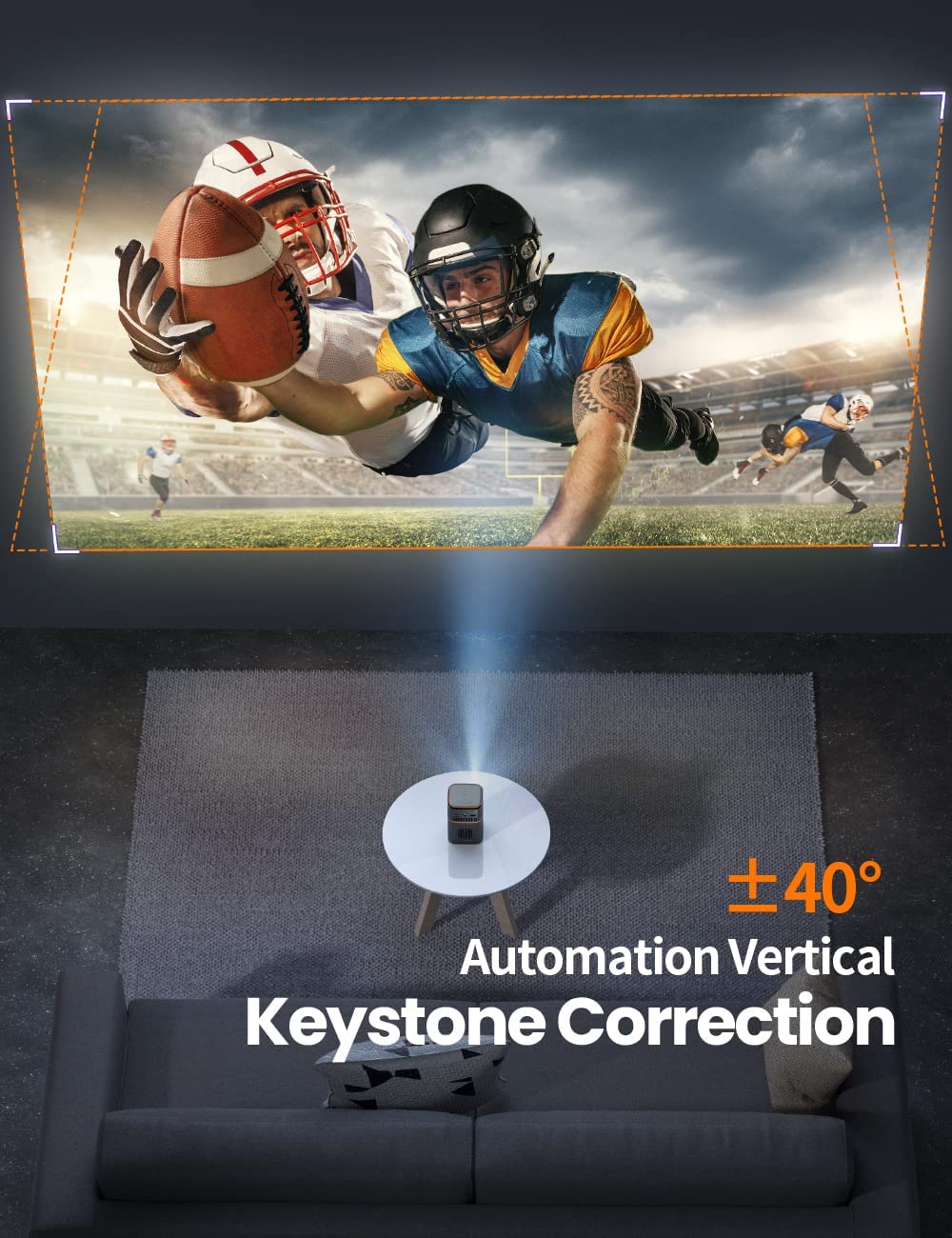 • ?【PORTABLE & AUTOMATIC KEYSTONE CORRECTION】:With a design more minor than the size of a soda can, this mini projector allows you to enjoy your favorite movies anywhere at home.This wireless projector has a built-in rechargeable battery, which can provide 2.5 hours of video on 1 charge, meeting outdoor needs. This pocket projector supports automatic vertical ±40° keystone correction, which helps to correct the image quickly.